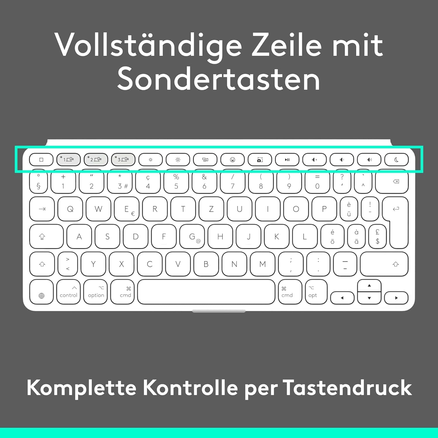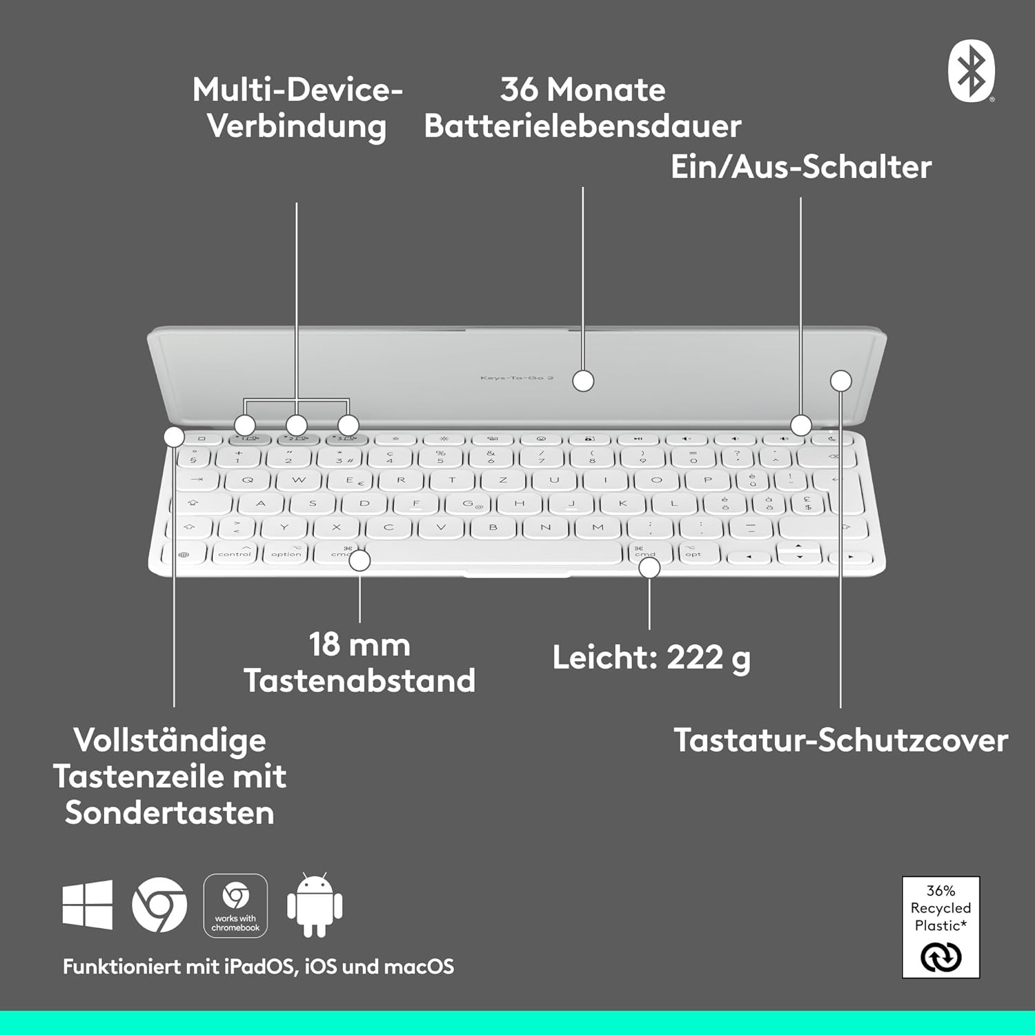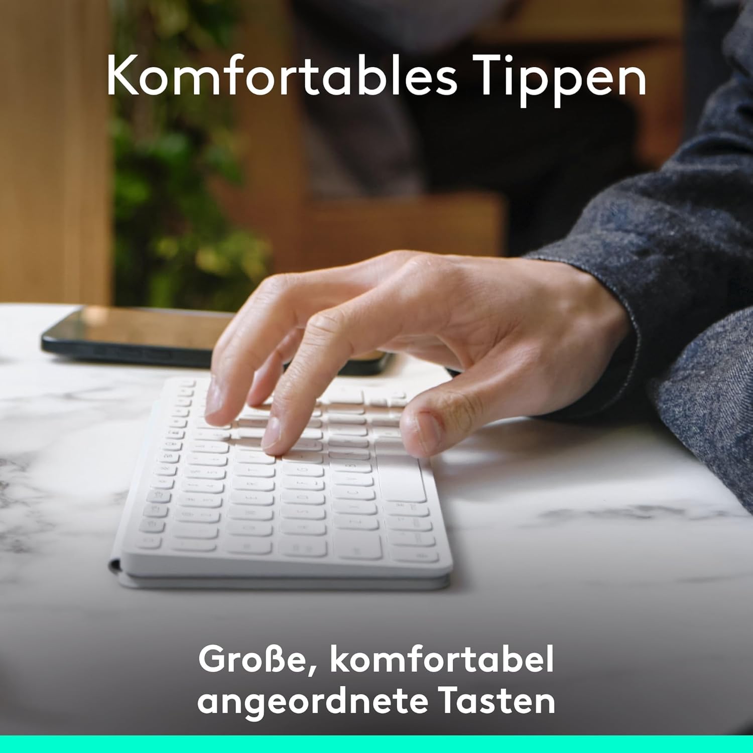Мобилна Bluetooth клавиатура Logitech Keys-To-Go 2 за таблети с вграден защитен калъф, тънка безжична клавиатура за Windows, Android, Linux, iPad, iPhone, Mac, Apple TV, DEU QWERTZ - светло сива