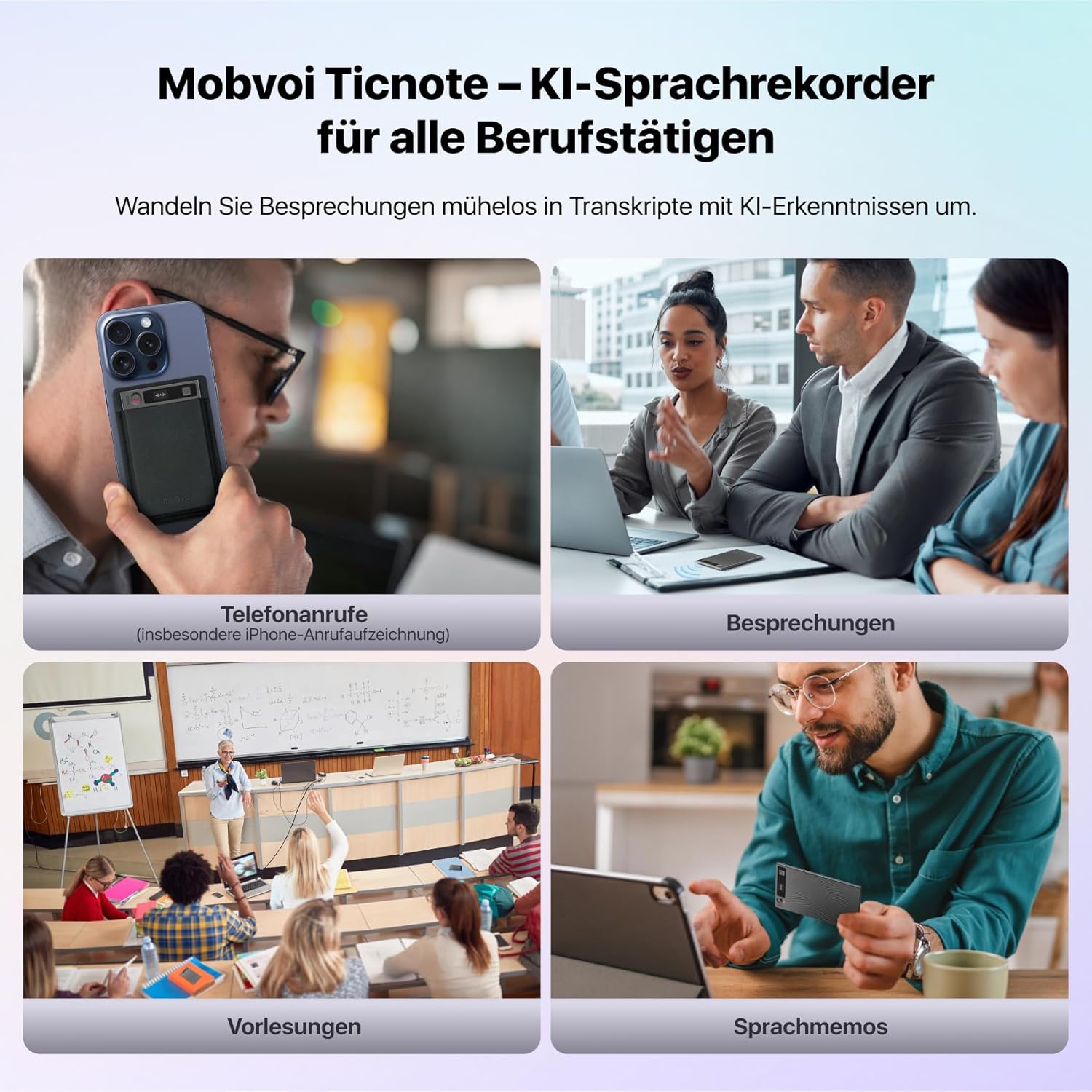 • Широка гама от сценарии на приложение: гласовият рекордер Mobvoi TicNote AI е подходящ за различни сценарии, като телефонни разговори, срещи, интервюта, записване на уроци по всяко време, звукови демонстрации, правни услуги, здравеопазване и др.