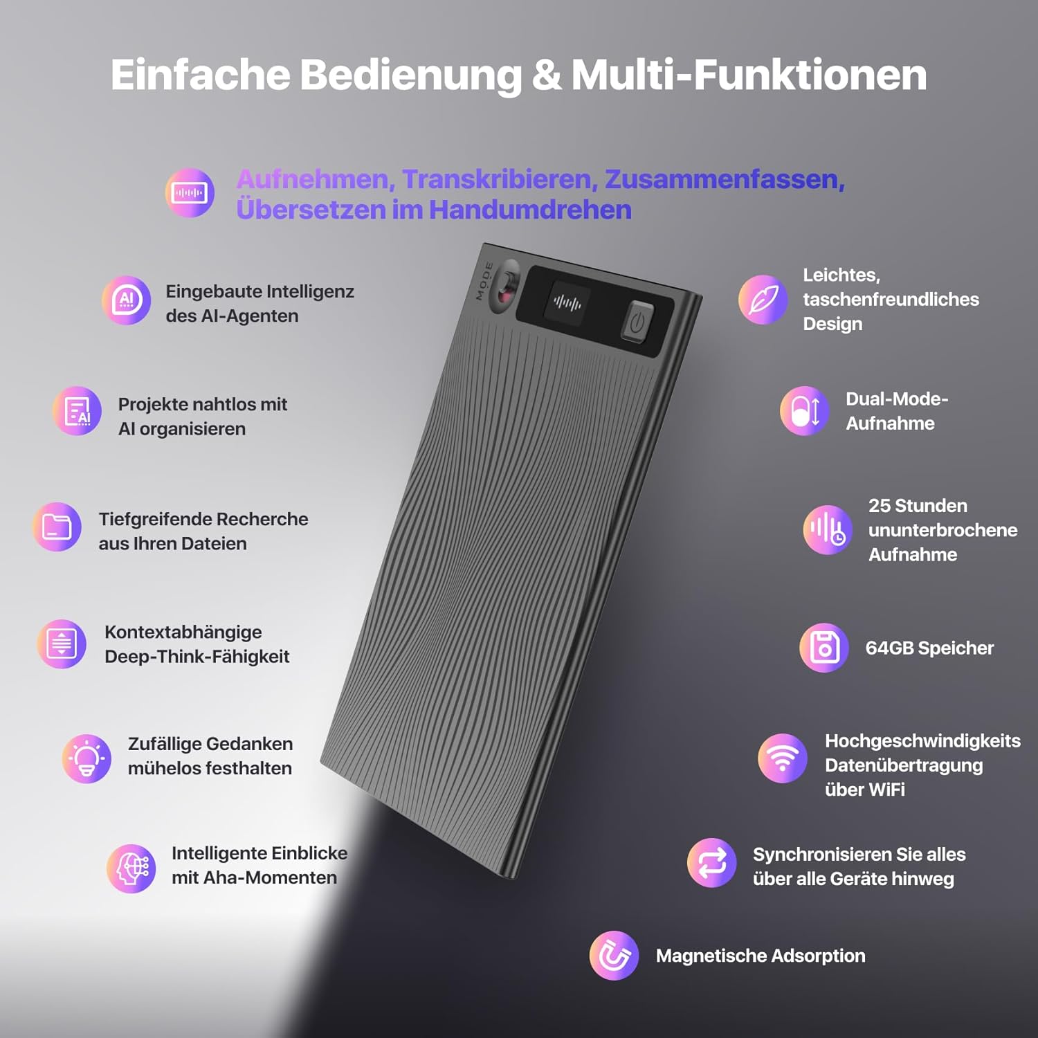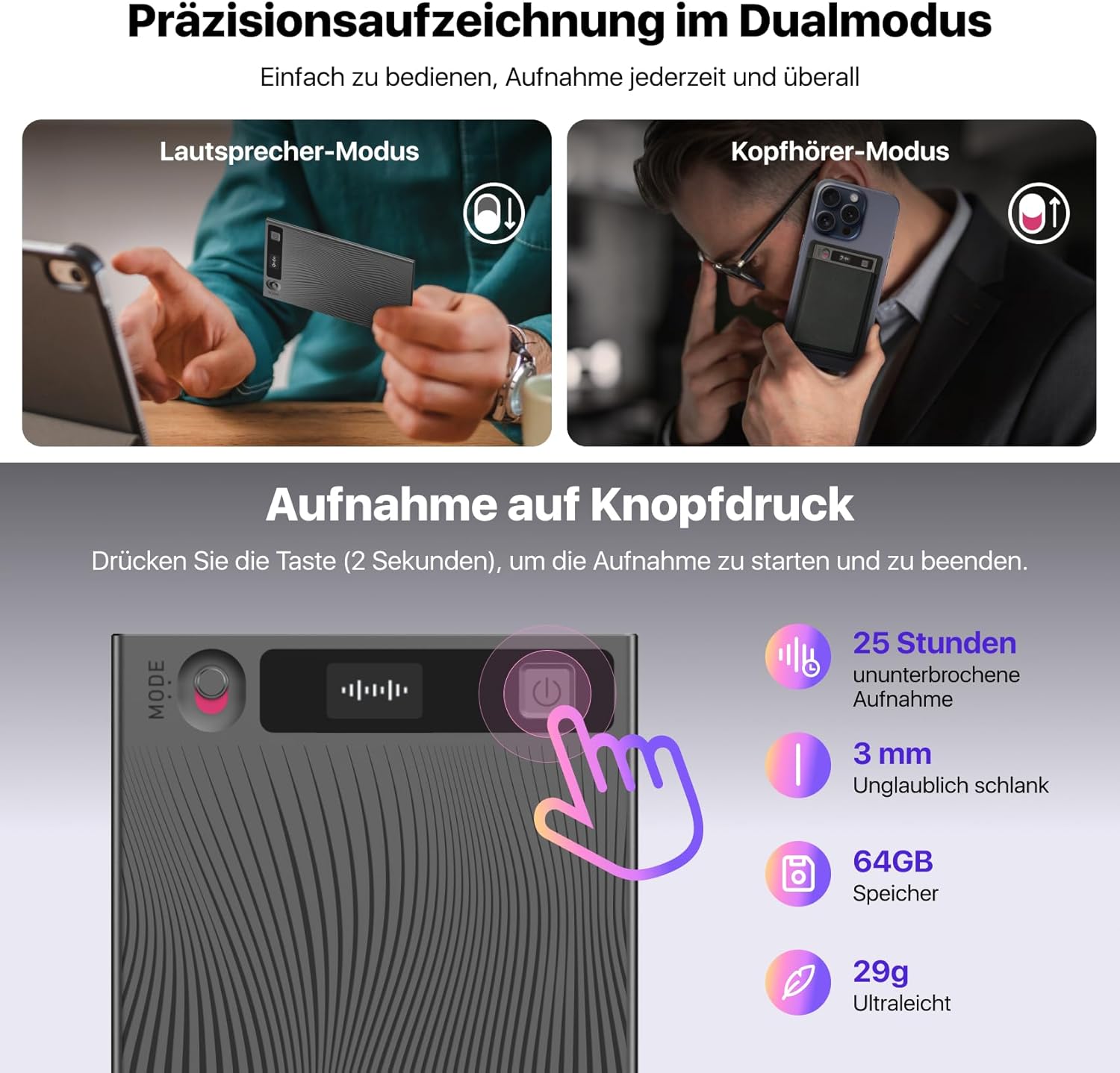 • Компактен и елегантен дизайн: Този елегантен гласов рекордер е проектиран за мобилност и производителност и се побира без усилие в джоба ви. Тънък, лек гласов рекордер, който осигурява професионално качество на звука, като същевременно е лек за носене. Размери само 86 мм x 55 мм x 3 мм, тегло 71 г. Има капацитет за съхранение от 64 GB и позволява до 25 часа непрекъснат запис. Дисплеят ви държи в течение по всяко време.