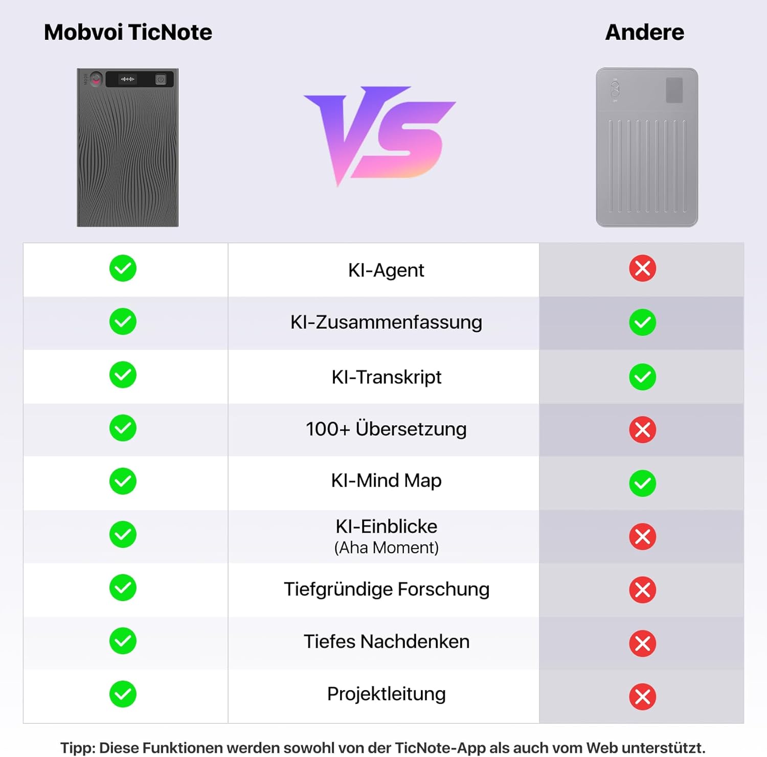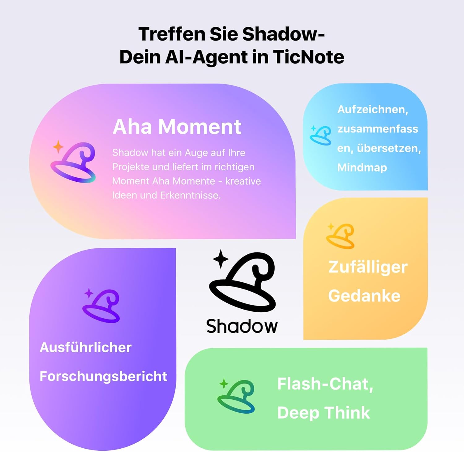 • AI агент: Shadow е интегрираният AI асистент от TicNote, който работи безпроблемно с хардуера и ви помага да мислите и организирате. Чатнете със Shadow за бързи отговори или с Deep Think. Използвайте онлайн търсене за анализи в реално време. Записвайте произволни мисли, независимо дали като гласови бележки или писмени бележки. За сложни задачи Deep Research ви помага да анализирате файлове с проекти и минали срещи на едно място.