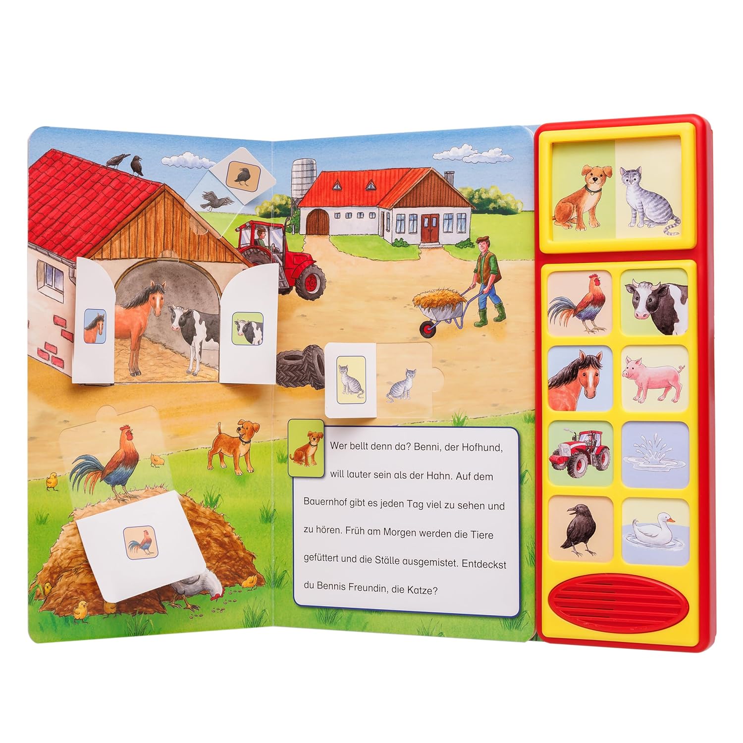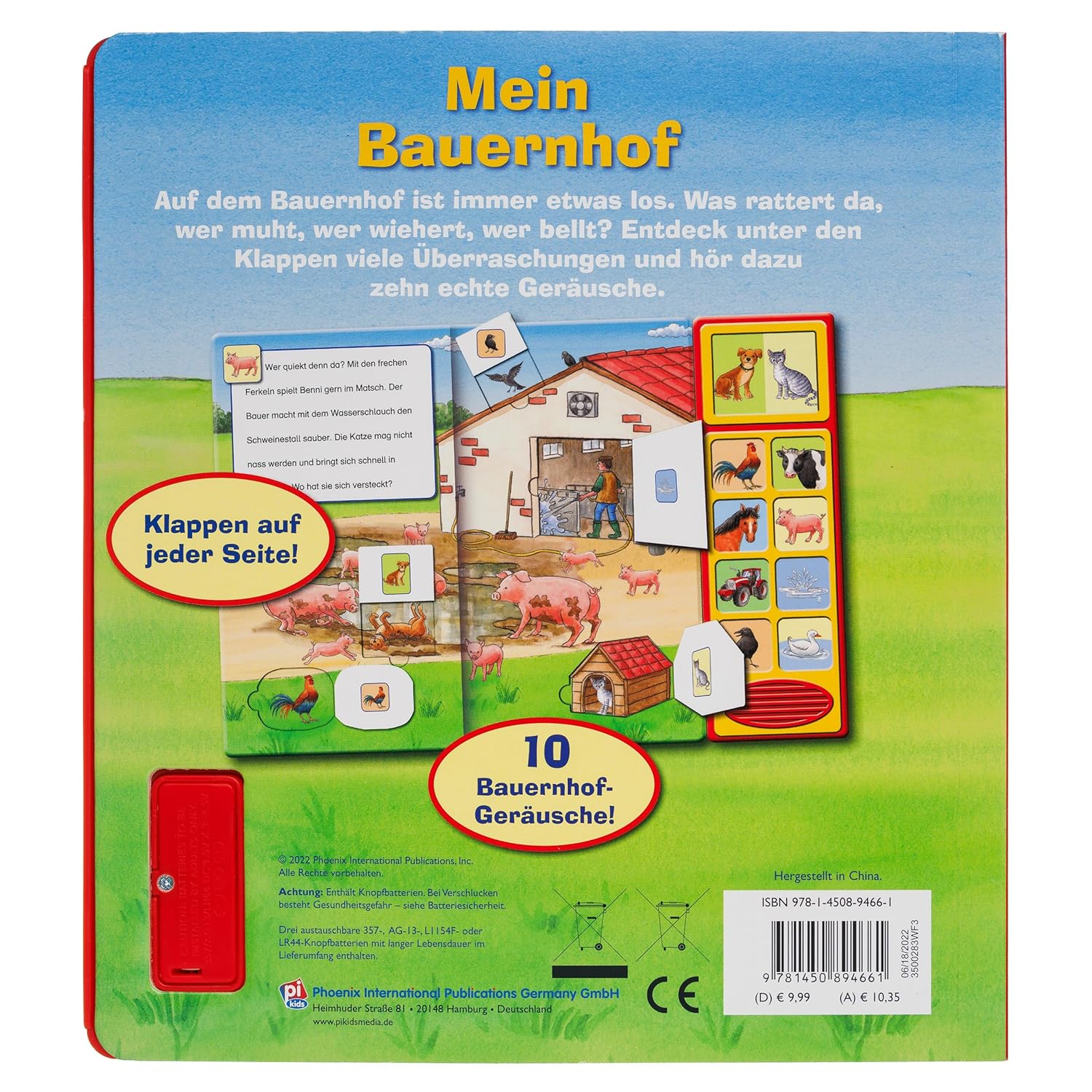 фермерския живот под капаците и чуйте десет истински фермерски звука. Тази вълнуваща книжка с картинки предлага много изненади за откриване и слушане на 14 богато илюстрирани страници. Тази картонена книжка с капаци от PI Kids, с внимателно подбрани звуци, плъзгащ се прозорец и 10 копчета, е прекрасен подарък за момчета и момичета на възраст 18 месеца и нагоре. Тази детска книжка е специална, защото... - Отварянето на капаците и натискането на копчетата насърчава фината моторика. - Цветните илюстрации по все по-популярната фермерска тема събуждат любопитството и креативността. - Животните и предметите във фермата могат да бъдат открити с истински звуци.