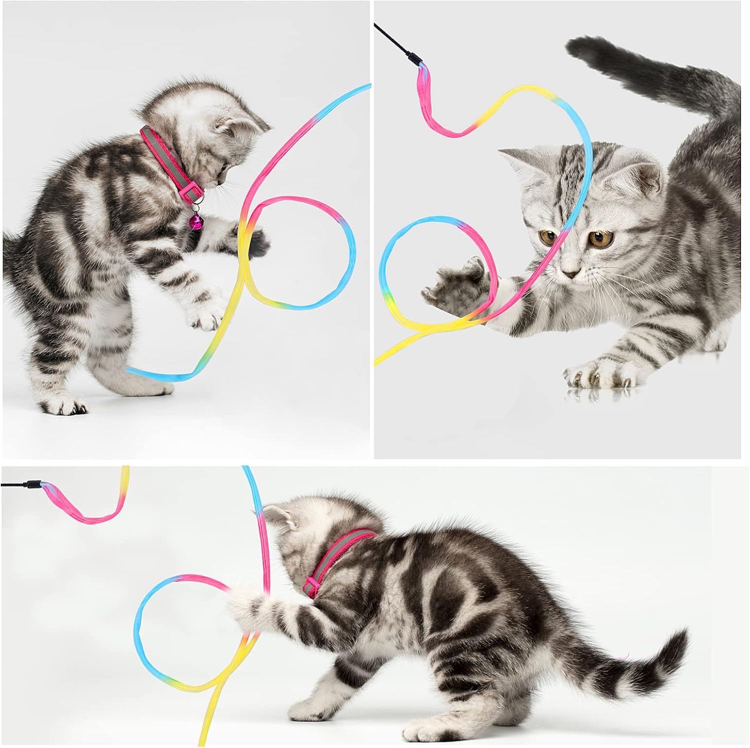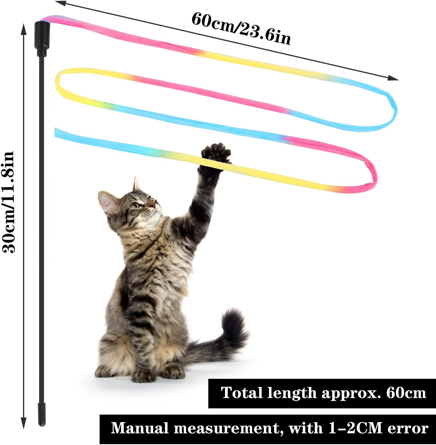 Котките обичат да гонят неща. Тази играчка за котки с дъга и вълшебна пръчка е перфектният избор за котки, гонещи дивеча. Атрактивният цвят активира естествения инстинкт на вашата котка да гони и скача, насърчавайки котката ви да прави здравословни дейности, като същевременно осигурява забавление. С леката, гъвкава пръчка и меката дъгова материя, вече не е трудна задача да дразните котката си.