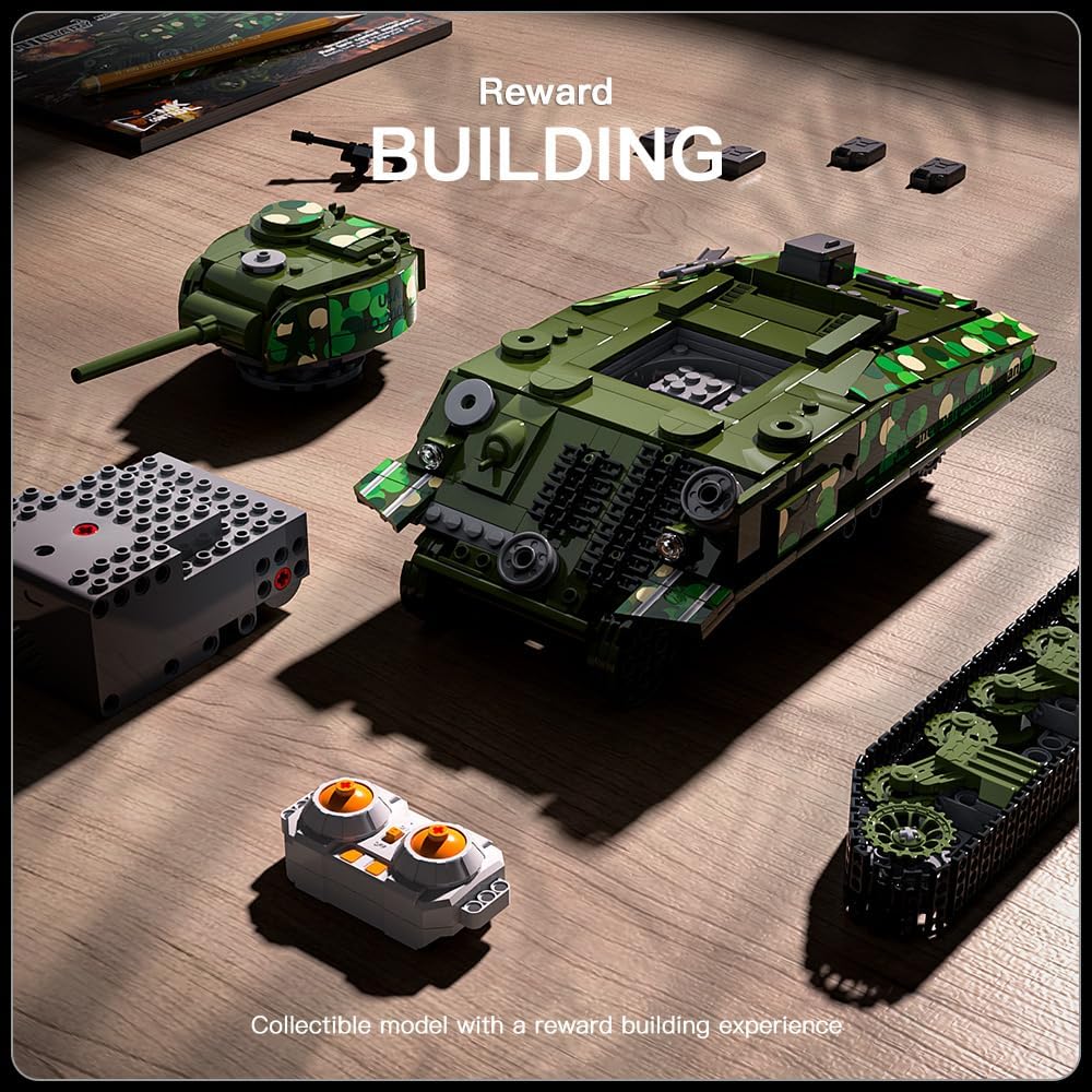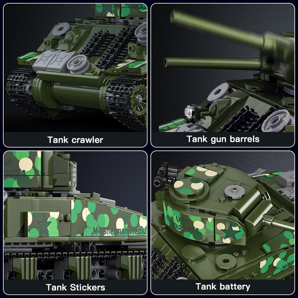 • Приятно сглобяване: модел от строителни блокове на резервоар, опаковката съдържа инструкции за сглобяване (английски език не е гарантиран). Цялото превозно средство има 961 части, а след сглобяване размерът на резервоара е 22,7 x 12,6 x 13,5 см, изработен от ABS материал, така че децата да могат да играят спокойно.