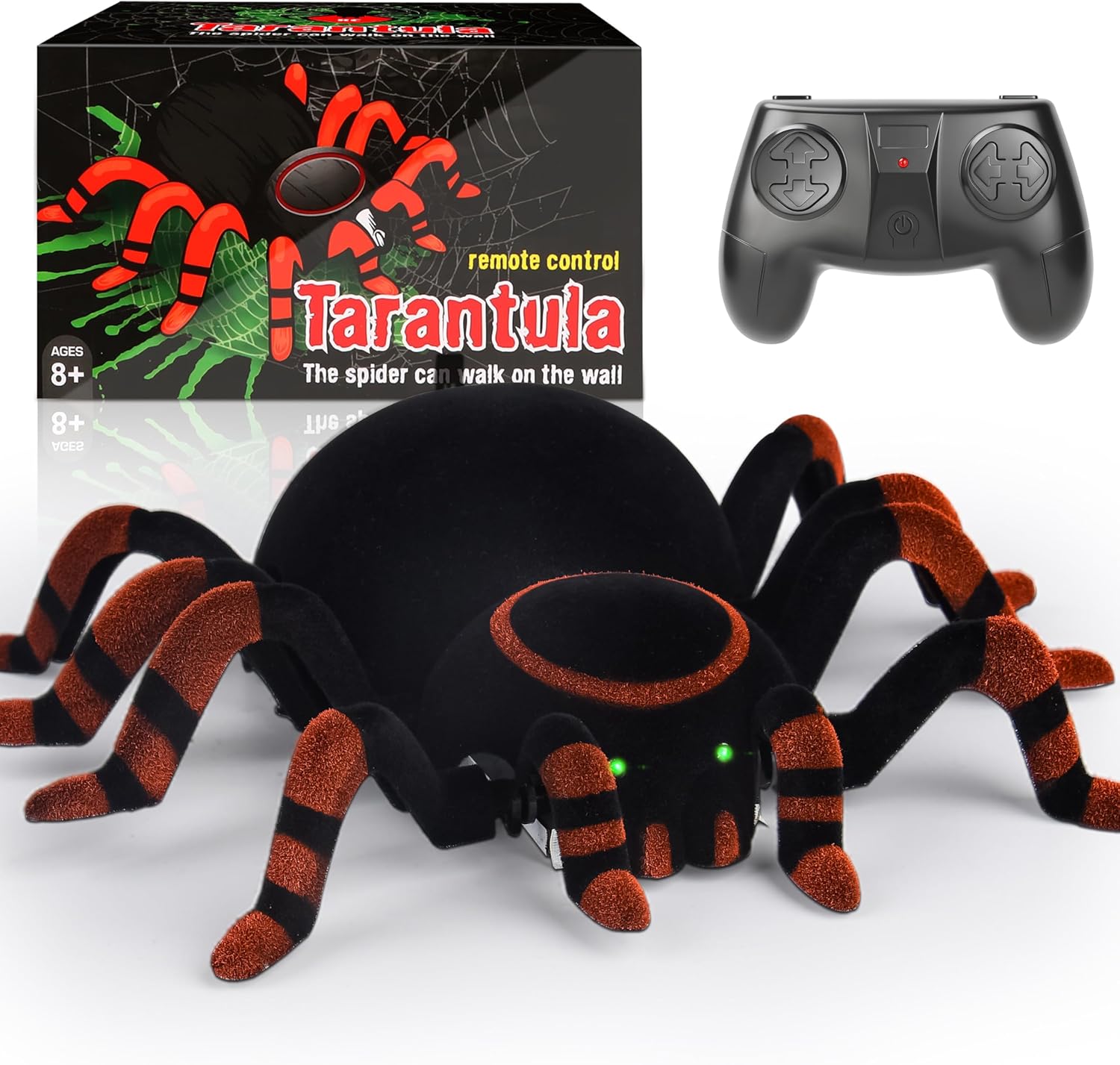 • Реалистичен дизайн: черното тяло с оранжевите ивици по краката на паяка изглежда измамно истинско. Пухкавата козина и зелените светещи LED очи придават на играчката страховито усещане.