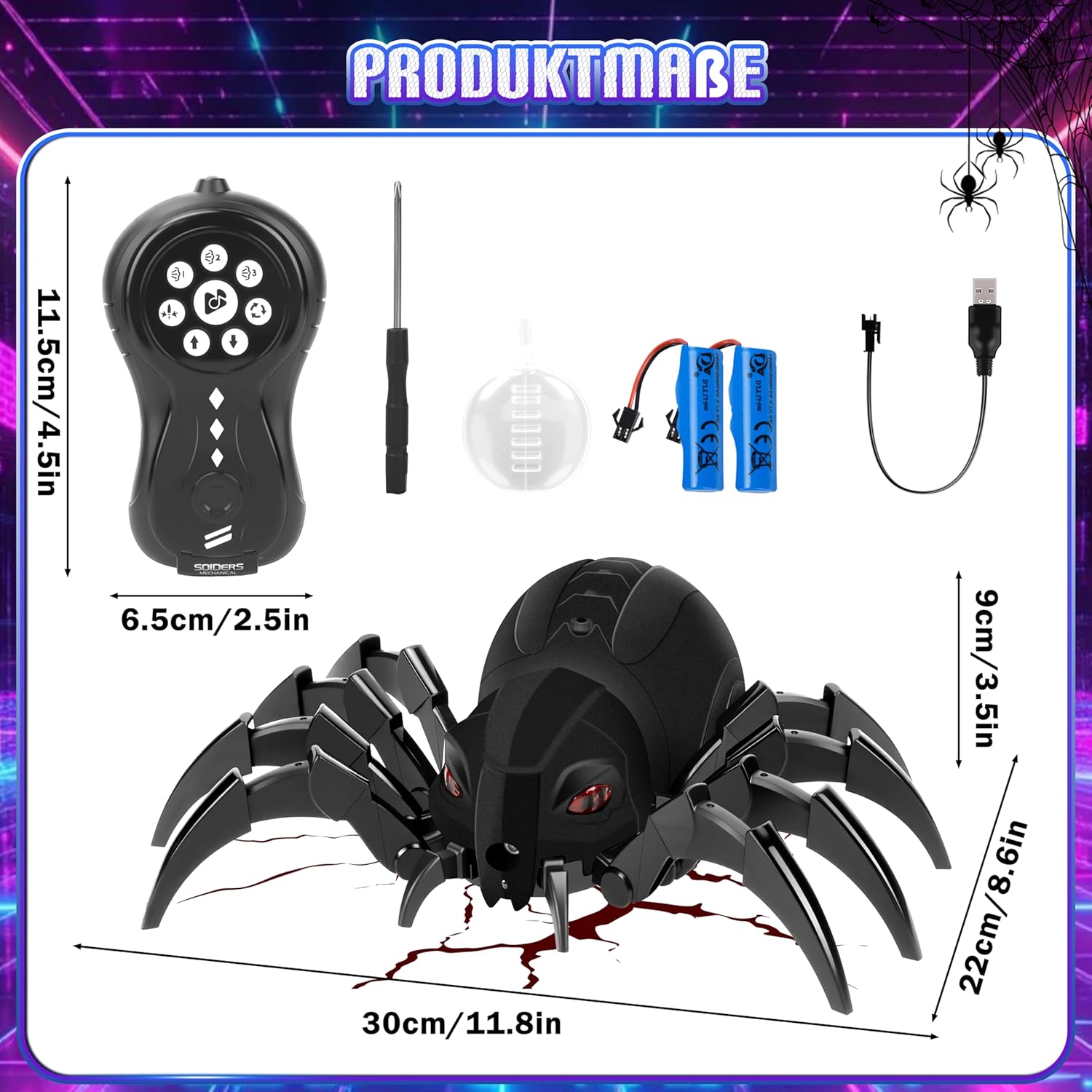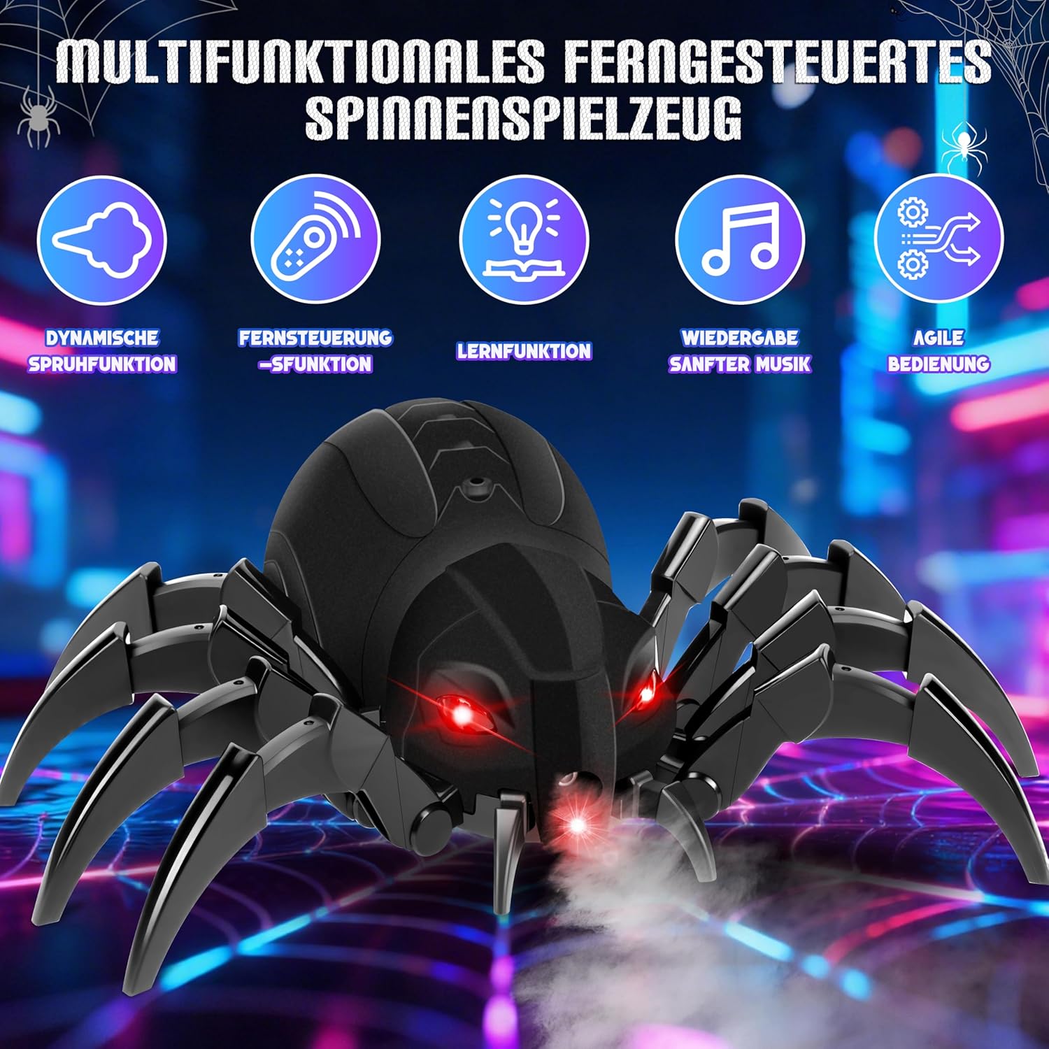 • Страхотен дизайн и функция: тази елегантна, изцяло черна играчка паяк има LED светещи очи, функция за пръскане и музикален режим. Светещите очи и разнообразните мелодии събуждат детското любопитство, а мъглата, която излиза при движение, имитира преденето на паяжина.