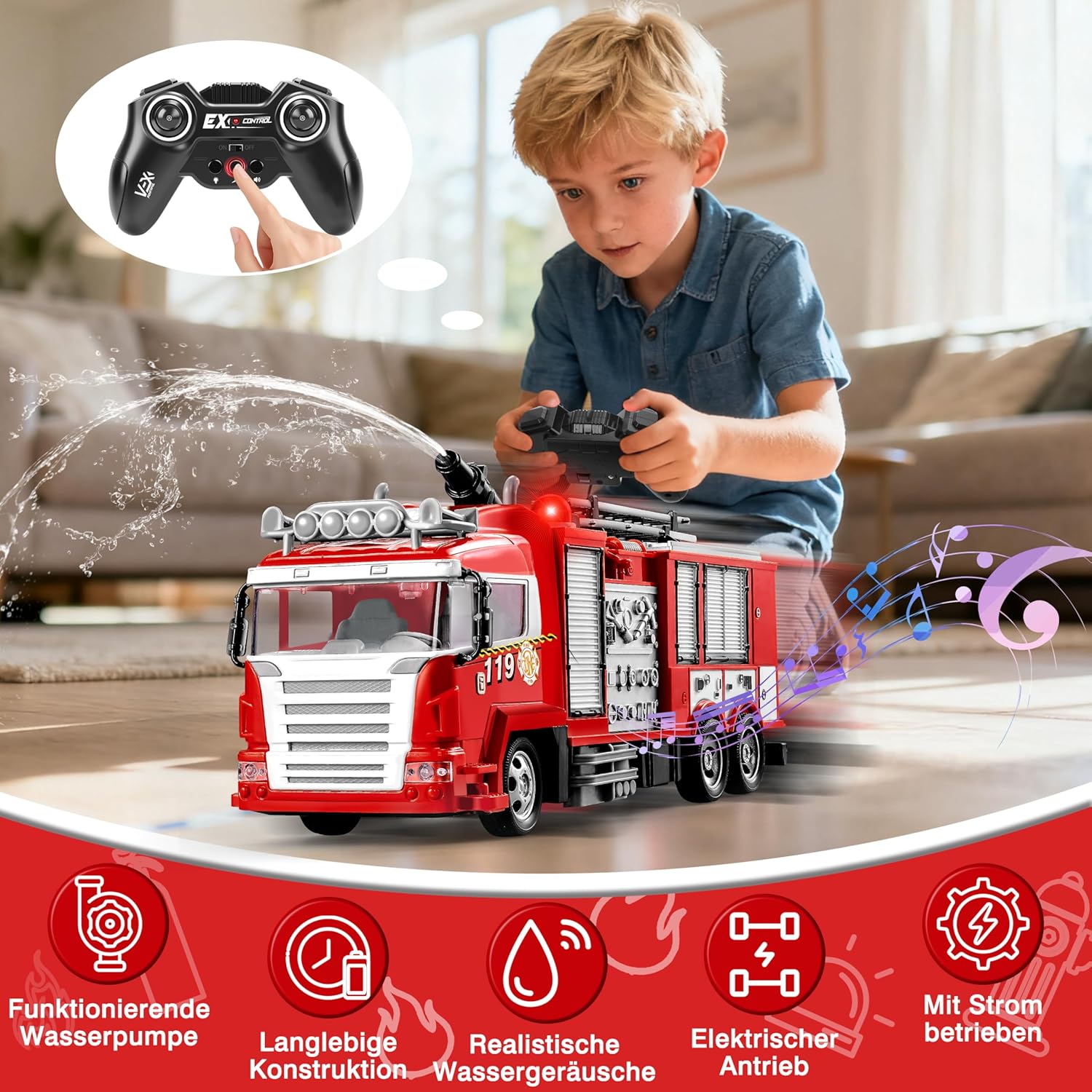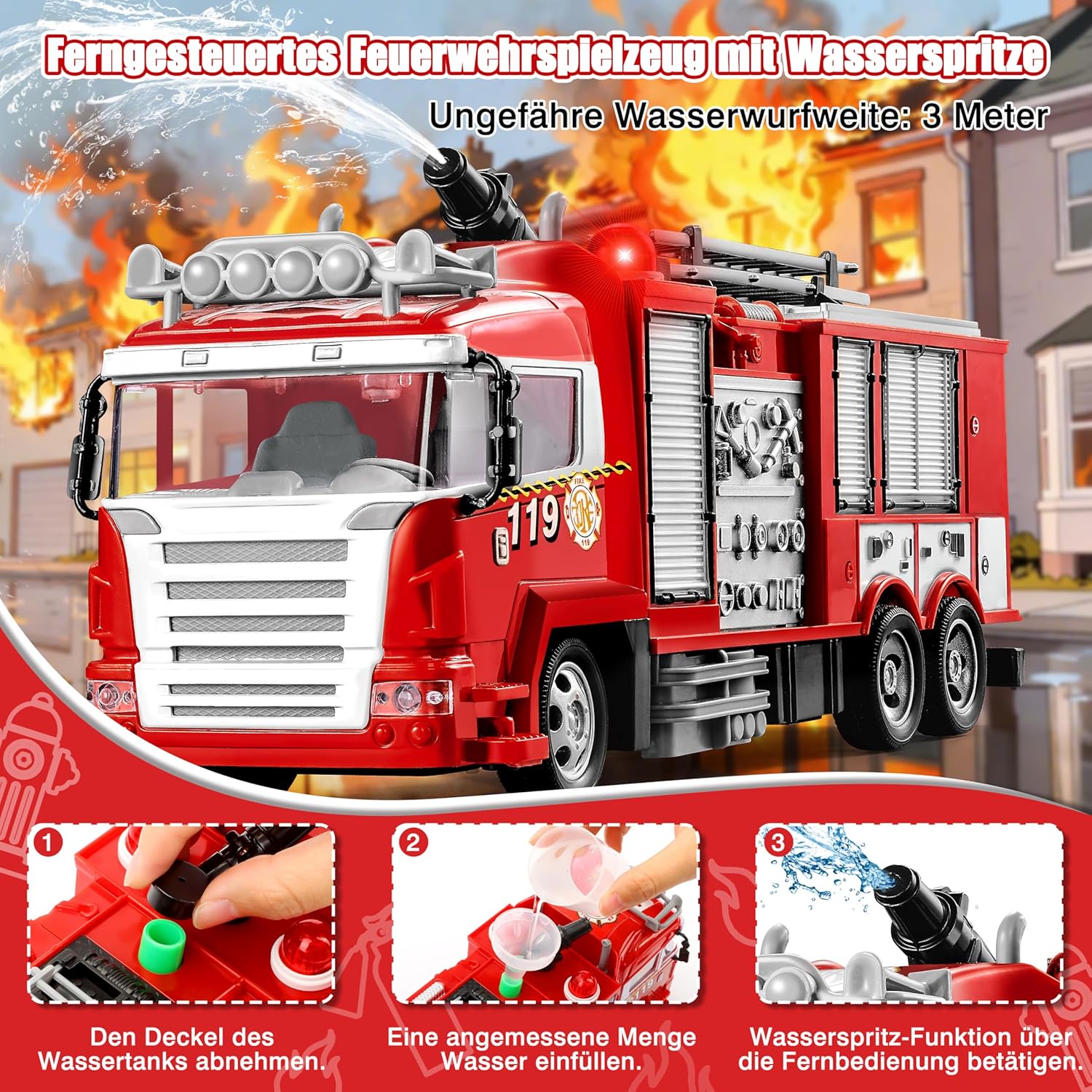• Многофункционална пожарна кола Тази пожарна кола с дистанционно управление е оборудвана с функция за пръскане с вода, може да се движи напред и назад, да завива наляво и надясно и разполага с готини светлини, звуци на сирена, както и 9 пътни знака. Многофункционалната играчка за пожарна предлага на всички малки пожарникари автентично спасително преживяване, стимулира детското въображение и осигурява часове забавление.