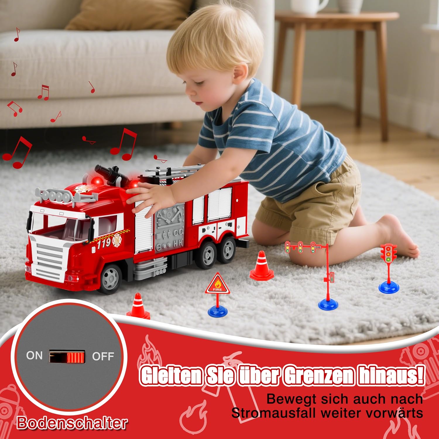 • Симулирани светлинни и звукови ефекти Играчката пожарна кола е оборудвана с реалистични звуци на сирена и мигащи синьо-червени предупредителни светлини. Тези светлинни и звукови ефекти симулират спасителни операции, което увеличава вълнението от спасителната мисия и предлага на децата завладяващо игрово изживяване! Идеална за употреба както на закрито, така и на открито.