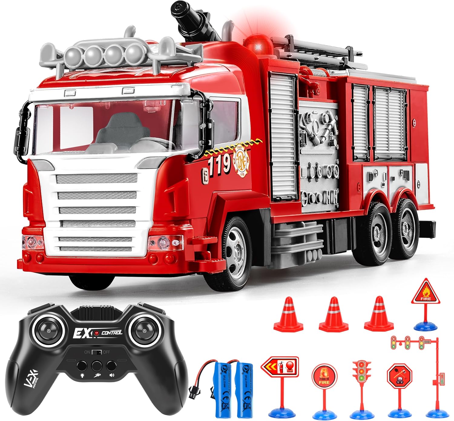 MOMOSTAR Пожарна кола с дистанционно управление, 1:18 пожарна кола със светлинен звук водна струя, играчка пожарна кола за деца от 3 4 5 6 години, голяма пожарна кола играчка подарък за момчета