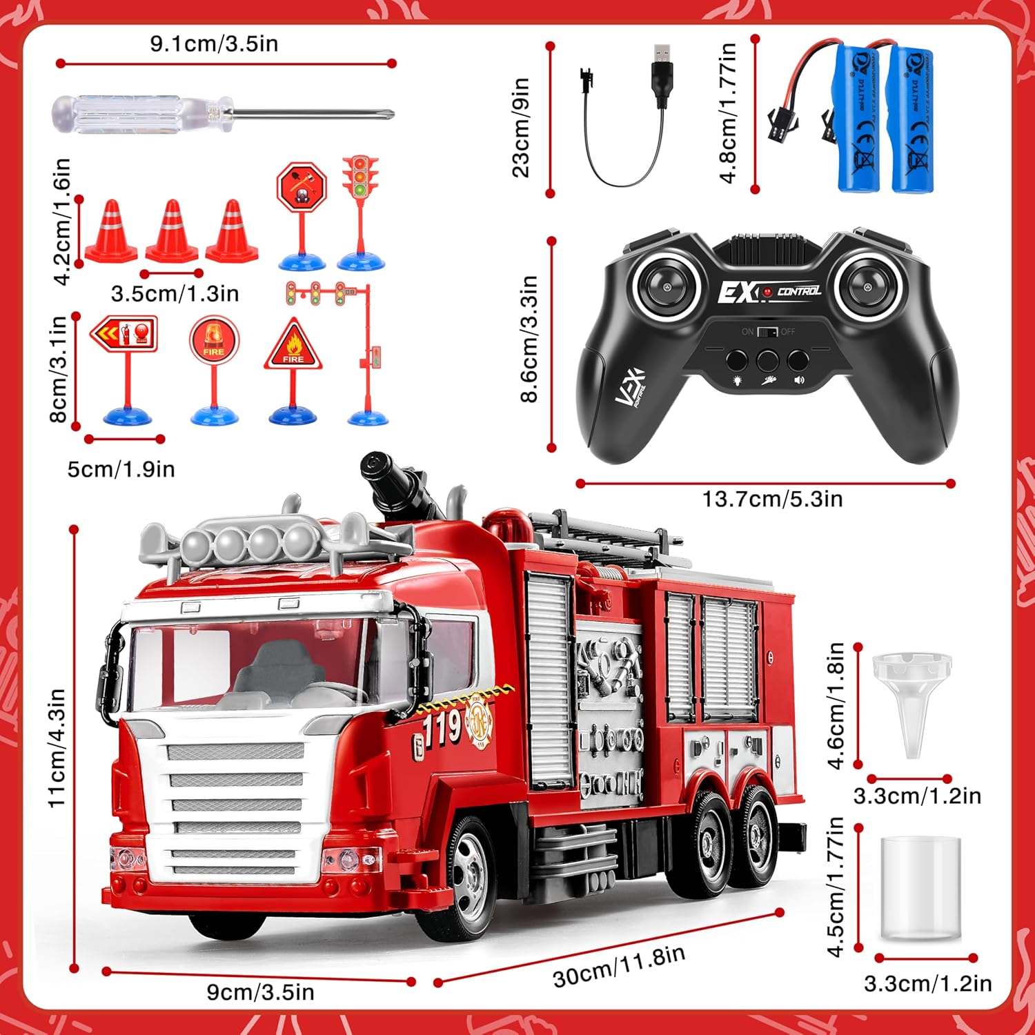 • Интелигентно дистанционно управление 2.4GHz Играчката пожарна кола се предлага с дистанционно управление 2.4GHz (необходими са 2 AA батерии), което има отделни функционални бутони за светлина, звукови ефекти и водни пръски, както и лост за управление за движение напред/назад и кормилно управление. Децата могат лесно да управляват превозното средство, да извършват прецизни маневри и игриво да развиват координацията си между ръцете и очите.
