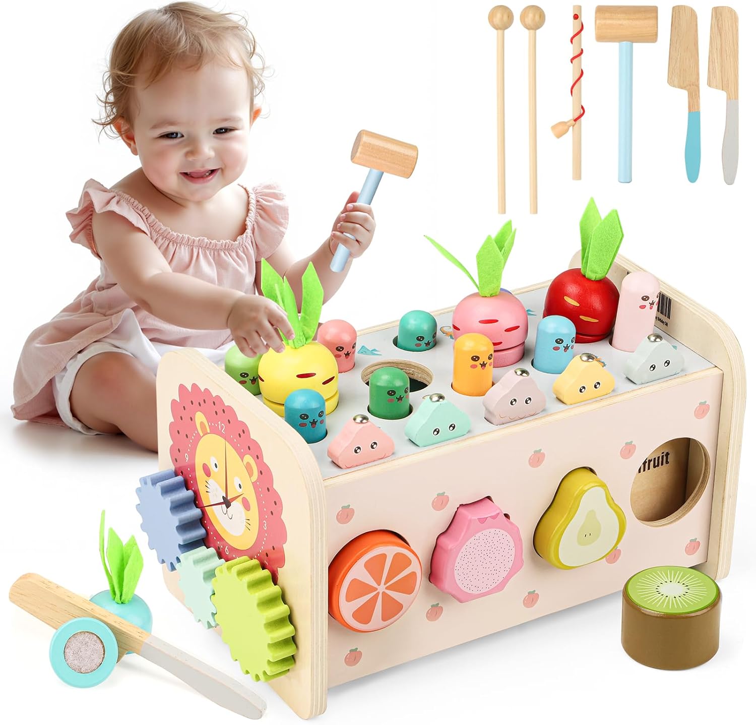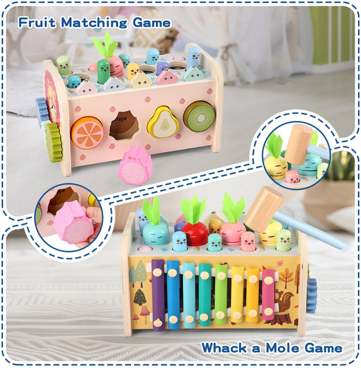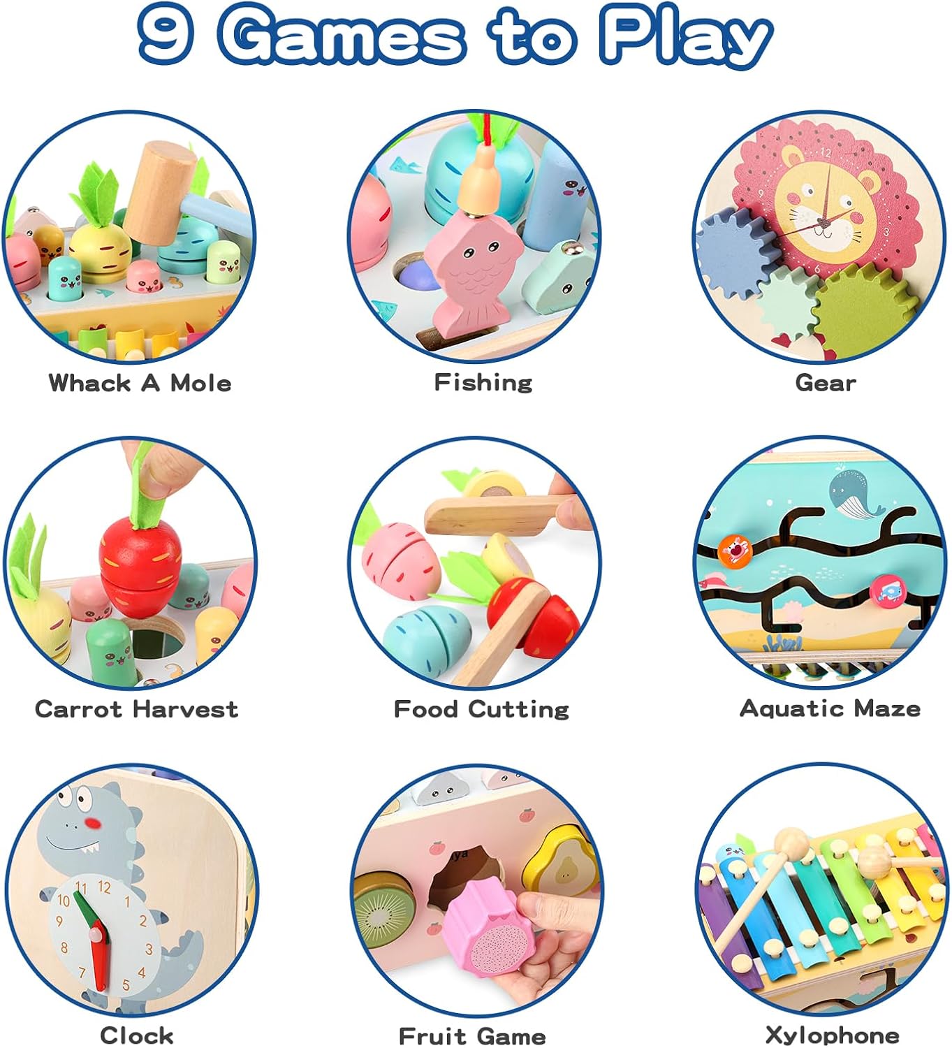 • Многофункционална дървена играчка - Тази детска играчка съчетава 9 игри в една: свирене на ксилофон, игра на къртица, риболов, събиране на моркови, рязане на храна, разпознаване на плодове, въртене на екипировка, изучаване на числа и време и изследване на лабиринти - тя предлага безкрайно забавление и държи малчуганите щастливо заети с часове.