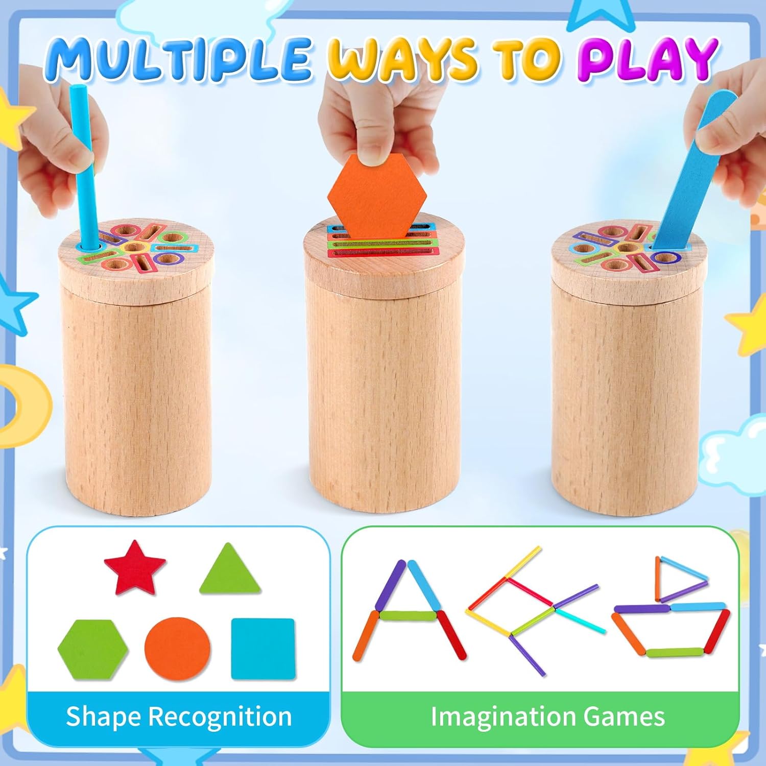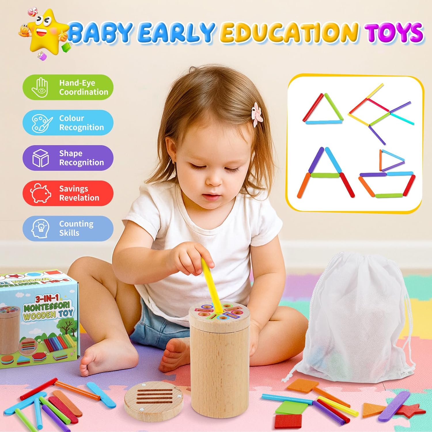• 【Играчка Монтесори за 2-годишни】 Бебетата могат да поставят дървени блокчета с различна форма в съответстващите дупки; те могат също така да научат имената на 5 прости форми (кръг, квадрат, триъгълник, шестоъгълник и пентаграма); и могат да практикуват подреждане. Тази играчка Монтесори за 1, 2 и 3-годишни включва много дървени пръчици и клечки за сладолед, което позволява на бебетата да развихрят въображението си и да сглобяват различни прости форми – идеални за образование в ранна детска възраст.