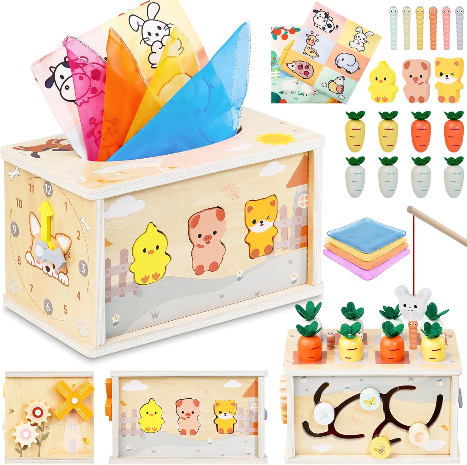 • Комплект бебешки играчки: Тази дървена играчка Монтесори с кубче за активност предлага 6 страни с различни функции и опции за игра! Комплектът включва 3 сладки дървени фигурки на животни, 4 меки кърпи, 1 гъста кърпа, 6 червея, 8 моркова и 1 въдица. Проектирана като сензорна и образователна играчка 8 в 1 за деца на възраст 1 и нагоре, тя е идеална играчка за момичета и момчета на 1-2 години.