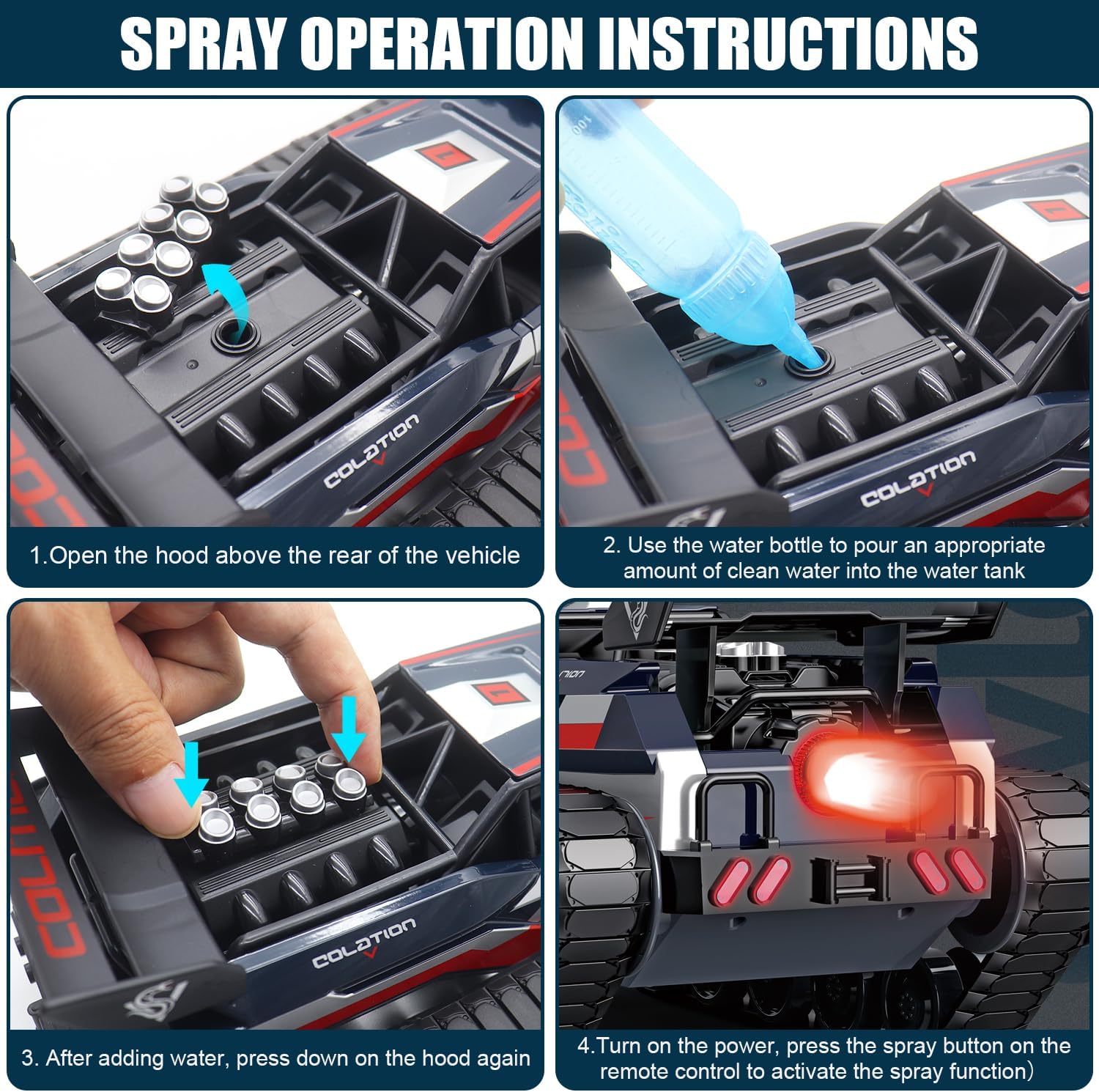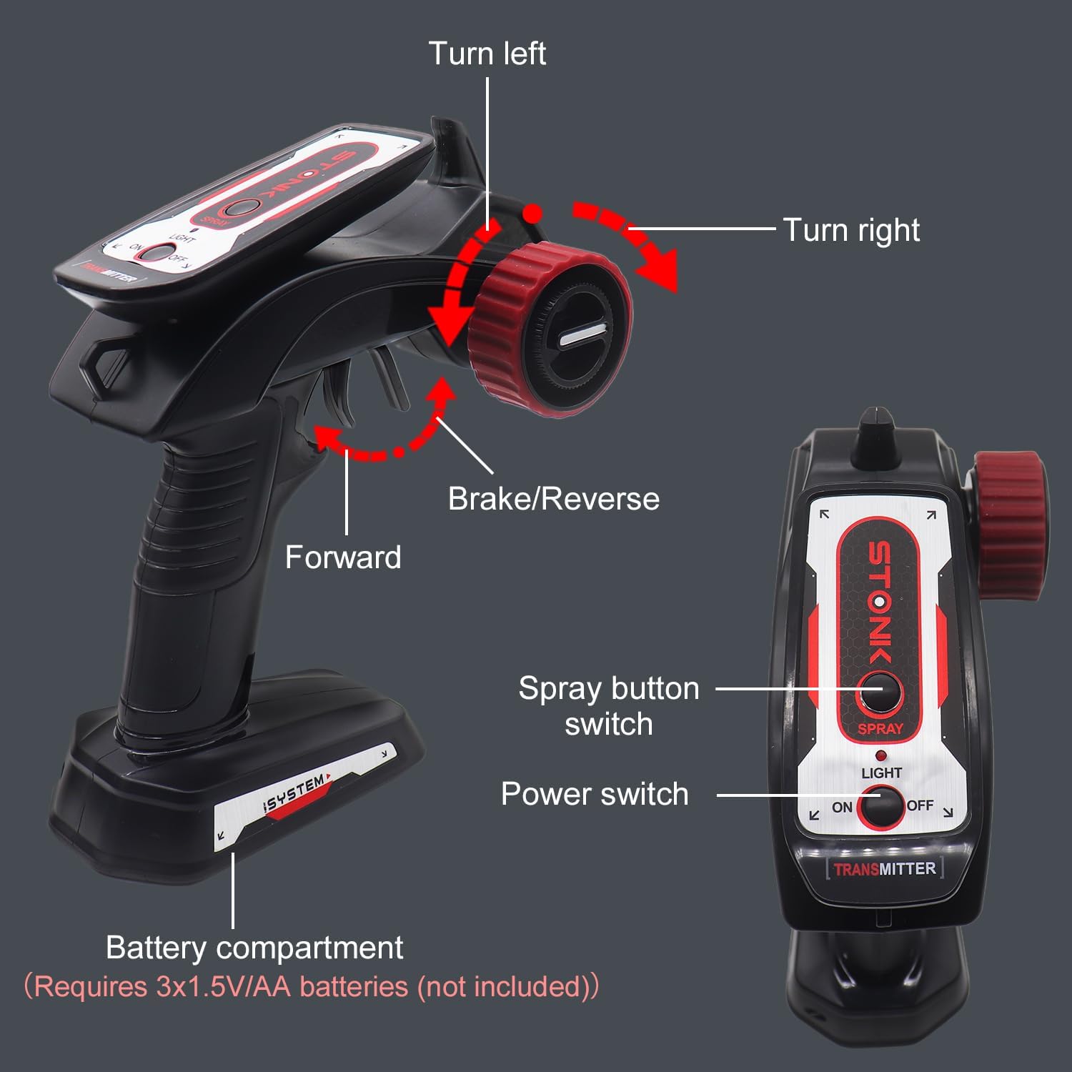 Die Fernbedienung wird verwendet, um das Auto zu steuern. Es kann vorwärts, rückwärts, gedreht und geneigt werden. Das Fahrzeug kann auch driften und eine Sprühfunktion ausführen. Es ist für den Einsatz auf verschiedenen Geländearten geeignet und hat eine starke Kletterfähigkeit auf Rasen, Stränden, Felsen und anderen komplexen Geländen.