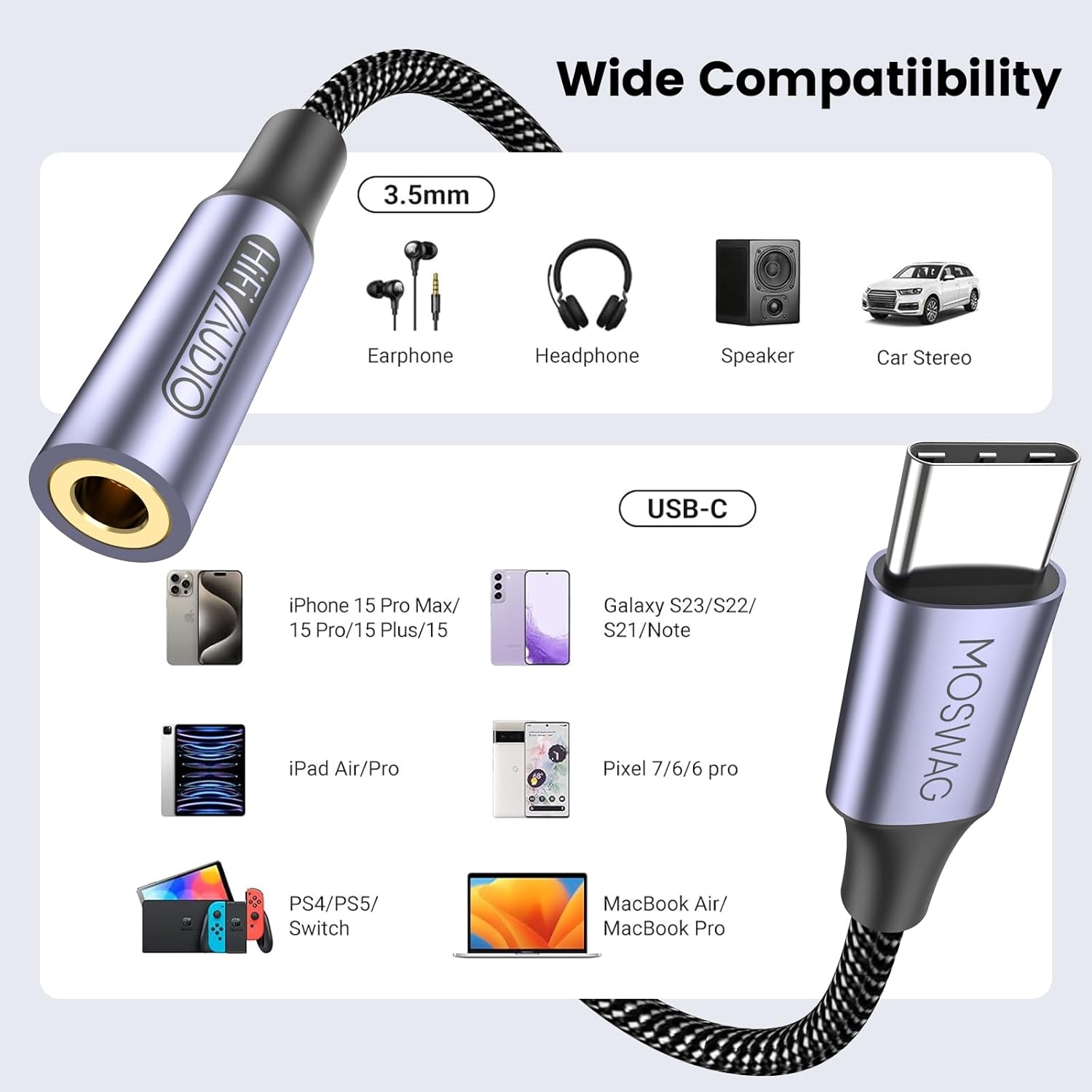 MOSWAG USB Type C към 3.5 мм жак за слушалки, аудио USB C към Aux адаптер за iPhone 16 Pro Max/16 Pro/16 Plus/16/15 Pro/15, Samsung Galaxy S24 S23 S22 S21 S20, Huawei, Pixel, iPad и други