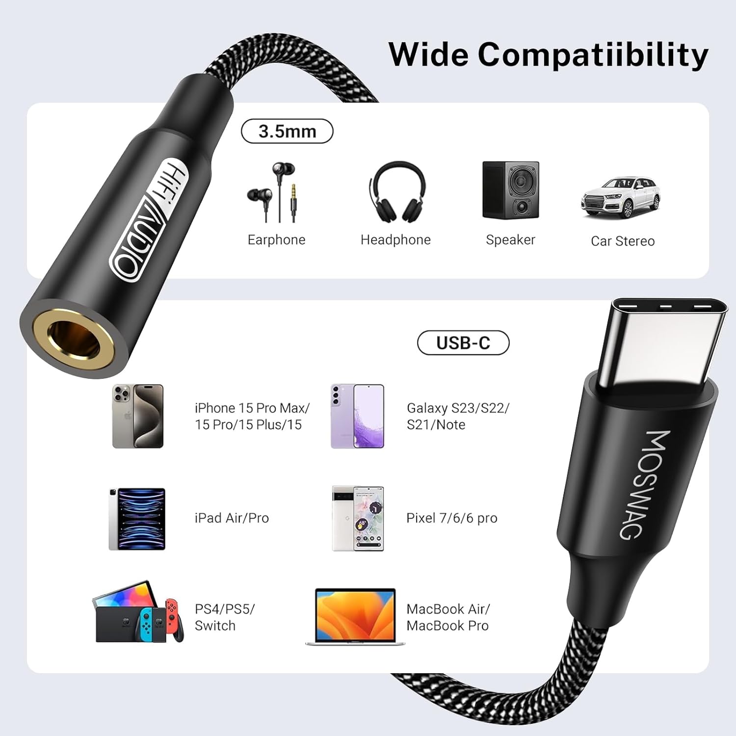MOSWAG USB Type C към 3.5 мм жак за слушалки, аудио USB C към Aux адаптер за iPhone 16 Pro Max/16 Pro/16 Plus/16/15 Pro/15, Samsung Galaxy S24 S23 S22 S21 S20, Huawei, Pixel, iPad и други