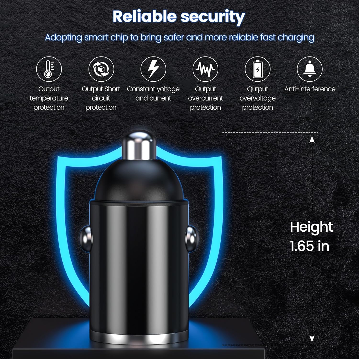 • Здрав изцяло алуминиев корпус: проектиран да държи: корпусът от алуминиева сплав с висока плътност на това зарядно за кола подобрява разсейването на топлината по време на зареждане и увеличава ефективността на зареждане с около 15% в сравнение с пластмасовите зарядни устройства. Насладете се на спокойствие без риск от топене или опасност. Изцяло металната конструкция не само гарантира безопасност, но и се отличава с отличителен дизайн и луксозна текстура, които подобряват вашето изживяване при зареждане.
