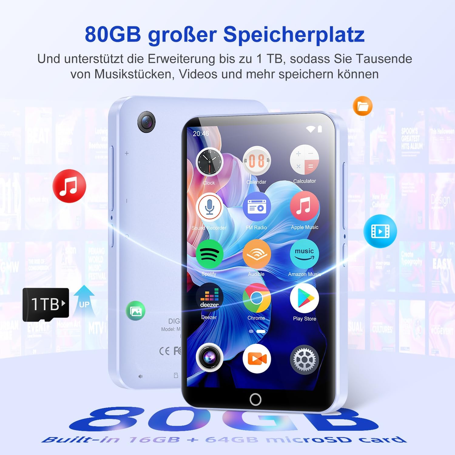• Голямо пространство за съхранение: С 2GB RAM, 16GB ROM и 64GB карта памет (включена), този Android MP3 плейър предлага много място за музика и видеоклипове. Разширяемо до 512GB.