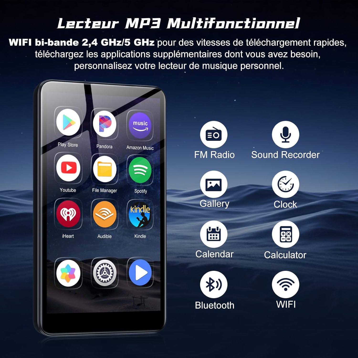 • Многофункционален: FM радиото обогатява музикалния ви избор или позволява слушане на съобщения. Диктофонът записва важно съдържание, докато учите или сте на срещи. Други функции, като будилник, калкулатор, браузър, Play Store и др., могат да отговорят на ежедневните ви нужди. Този MP4 плейър разделя работата и живота ви и ви позволява да се наслаждавате на времето за удоволствие без прекъсвания. Той е и чудесен подарък за вашето семейство или приятели.