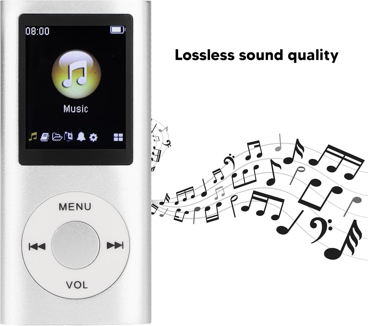 • Качество на звука без загуби Преносимият MP3 музикален плейър има качество на звука без загуби и поддържа MP3, WMA, FLAC, APE, AAC, OGG и ACELP.