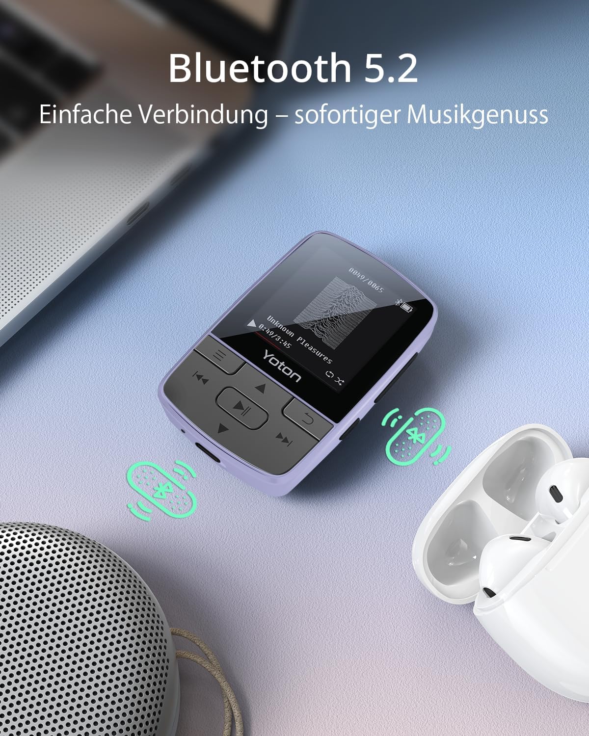 • Стабилен Bluetooth 5.2: Насладете се на стабилна връзка с най-новия Bluetooth 5.2 от mp3 плейъра YOTON. Безпроблемно и без прекъсвания на сигнала - за безпроблемно сдвояване с всички ваши устройства. (Забележка: mp3 плейърът не поддържа Bluetooth връзка със смартфони или компютри.)
