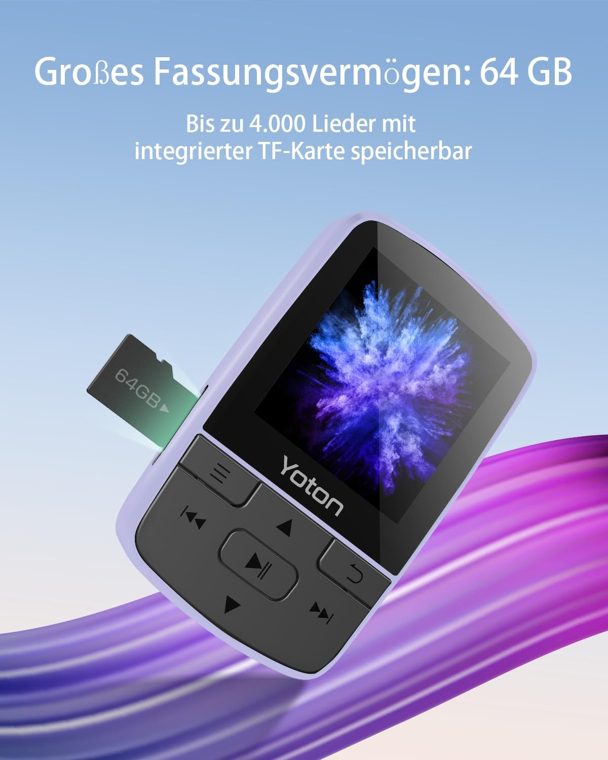 • Просторна музикална библиотека: Преносимият музикален плейър YOTON предлага 64 GB вътрешна памет - достатъчно място за над 4000 песни. С разширяема памет (до 128 GB) имате още повече място за висококачествена музика. Наслаждавайте се на любимите си песни по всяко време и навсякъде!