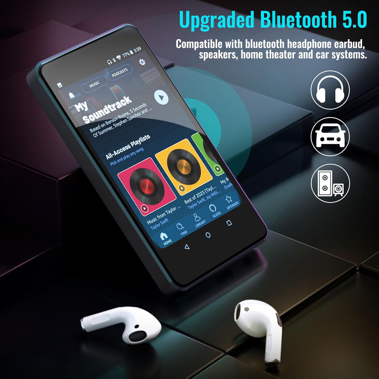 • Bluetooth и Wi-Fi: Устройството разполага с Bluetooth V5.0 и WiFi за безпроблемна връзка със слушалки, високоговорители и автомобилни Hi-Fi системи. Осигурява бързо сдвояване и стабилни връзки и гарантира безпроблемно онлайн и офлайн музикално изживяване.
