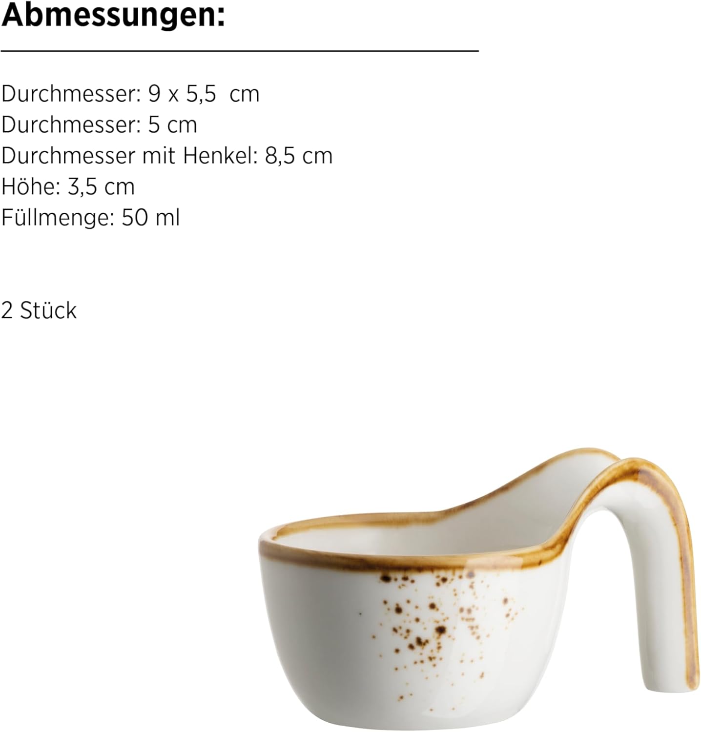 • Финият кафяв ръб на чашите и чинийките за кафе и привидно произволните кафяви точки на този комплект хармонират перфектно със светлокремавата пълна глазура и придават на чашите елегантен ръчно изработен щрих.
