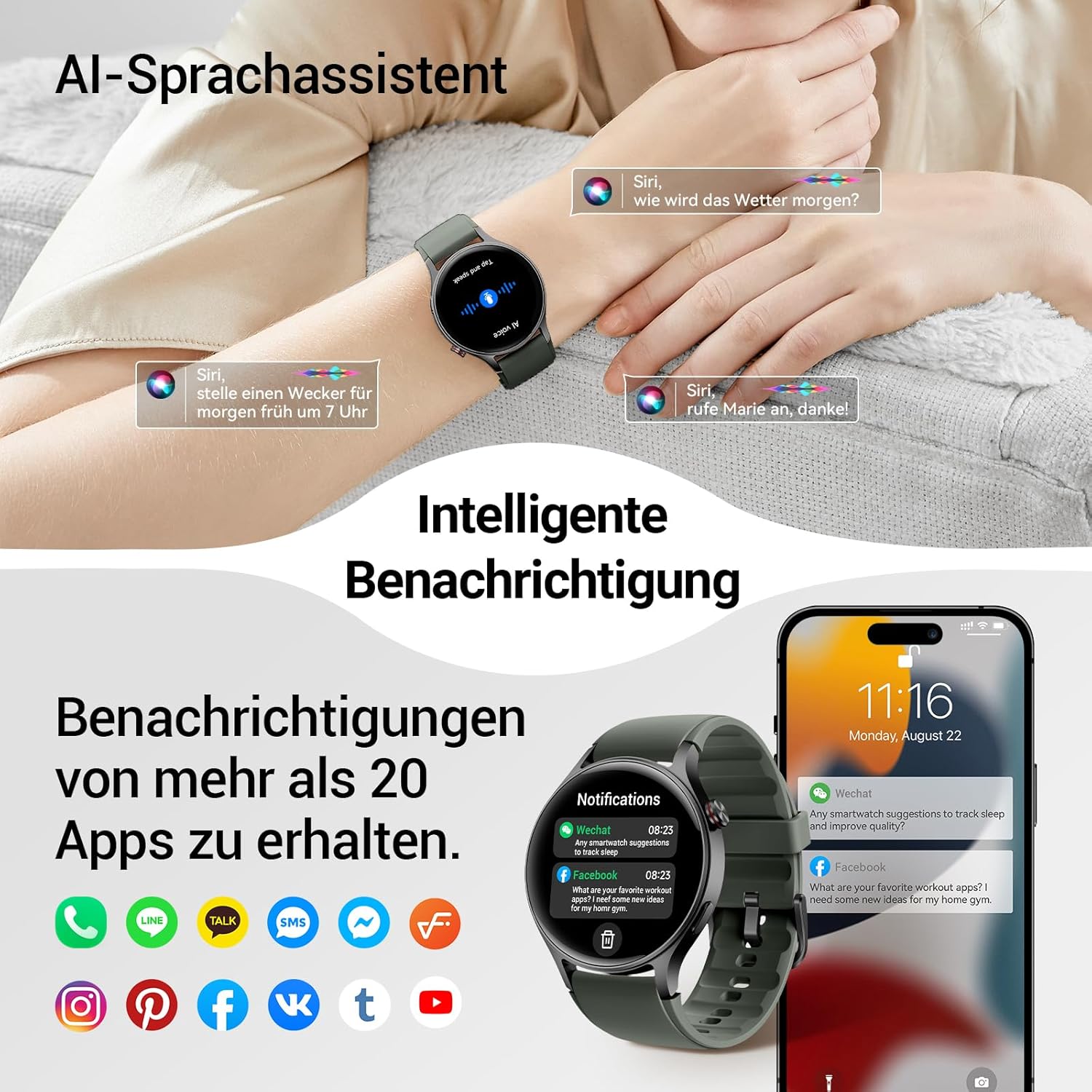 • Интелигентни известия в реално време: Този смарт часовник с функция за телефон ви позволява да отговаряте на повиквания и да получавате известия за SMS, имейли, WhatsApp и съобщения от приложения директно на китката си. Освен това можете да използвате гласовия асистент на вашия смартфон (Siri, Google Assistant и др.), за да управлявате всички функции по-удобно и интуитивно.