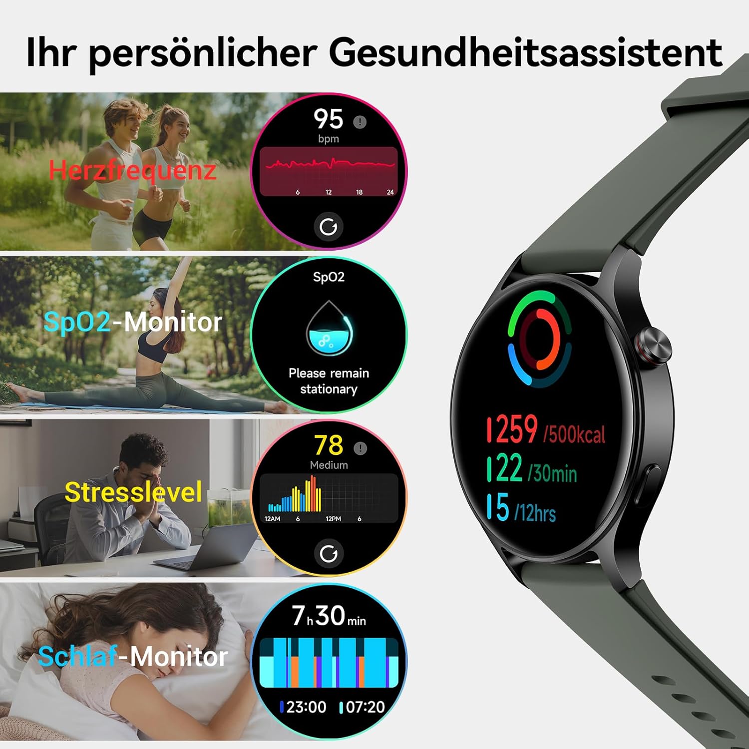 • 24/7 здравен часовник за мъже и жени: Този фитнес часовник осигурява цялостно наблюдение на здравето в реално време, включително сърдечен ритъм, кислородна сатурация (SpO₂), ниво на стрес, анализ на съня и проследяване на цикъла за жени. Идеален за ежедневна употреба и спортни дейности, за да следите здравето си.