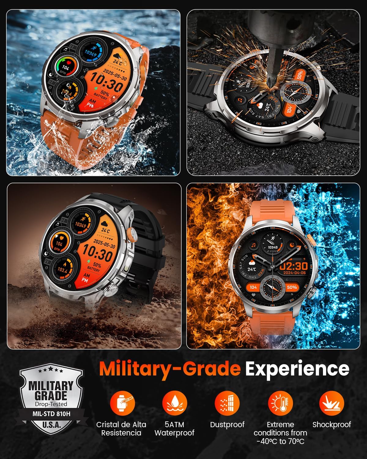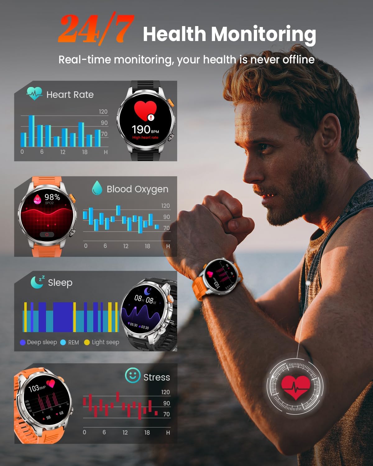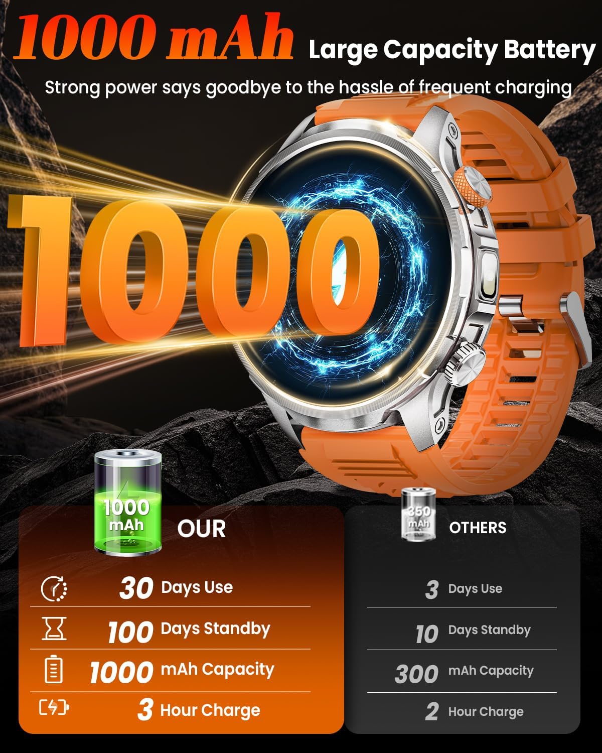 • Военен дизайн и ултра дълъг живот на батерията: този военен смарт часовник за мъже предлага тройна военна защита (удароустойчива, устойчива на надраскване и устойчива на падане) и е водоустойчив до 5 ATM. Това го прави идеален за тежки условия на открито и подводни предизвикателства. Мъжкият смарт часовник има вградена батерия от 1000 mAh с до 30 дни живот на батерията и 100 дни в режим на готовност с 3 часа бързо зареждане. Странична LED светлина осигурява удобно осветление по време на нощни дейности на открито и при спешни случаи.