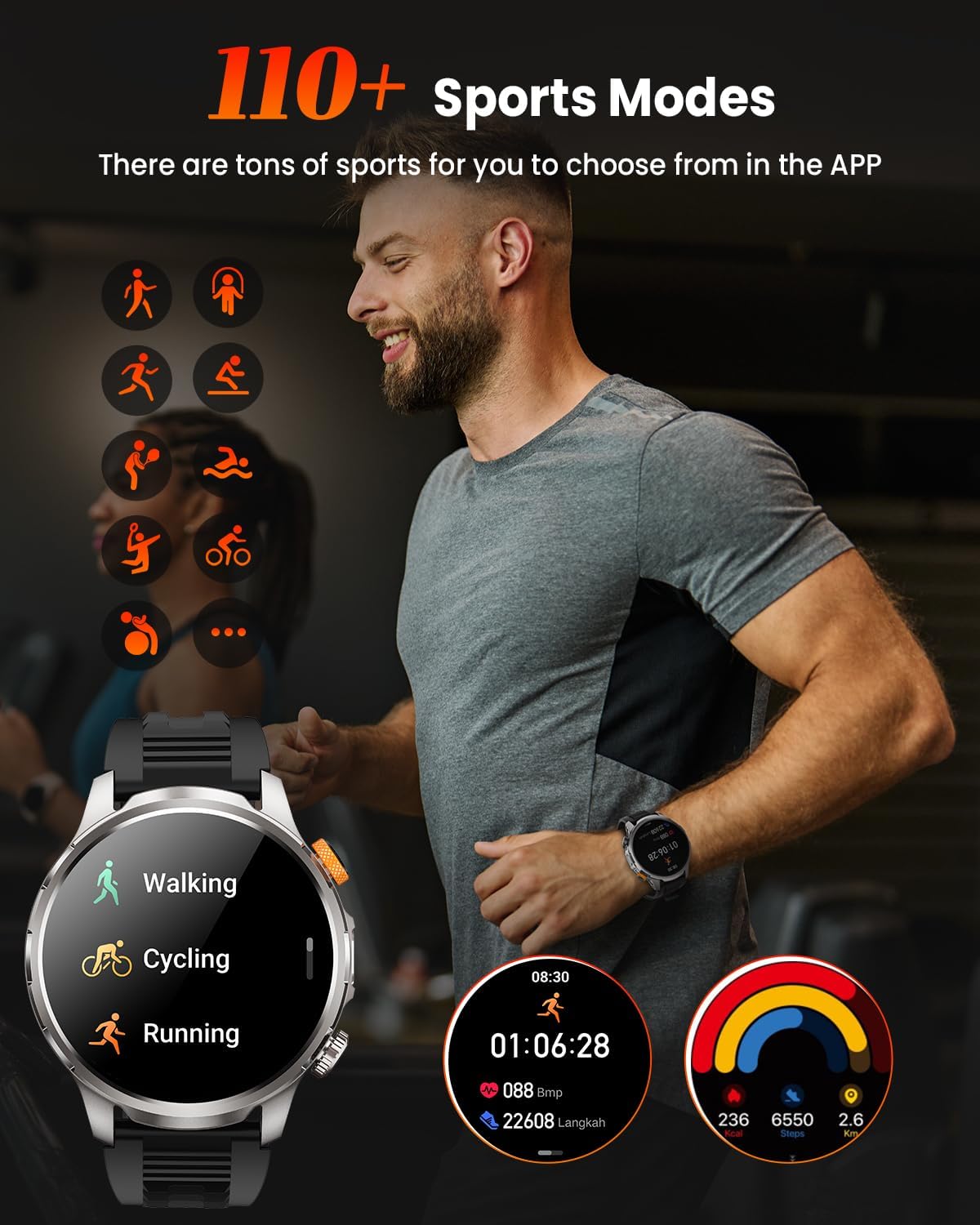 Мъжки военен смарт часовник с батерия 1000 mAh, 1.91-инчов AMOLED дисплей, LED фенерче/5ATM водоустойчив фитнес часовник с функция за телефон, 110+ спортни режима / пулс / монитор за сън / SpO2 iOS Android