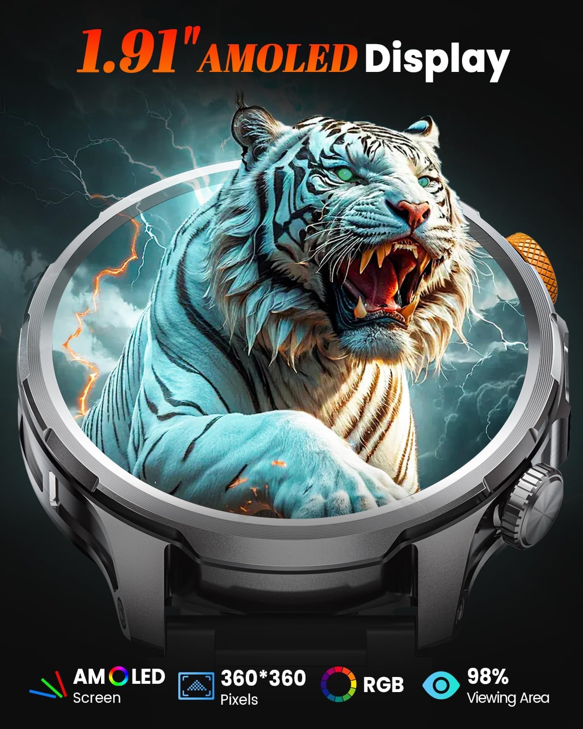 Мъжки военен смарт часовник с батерия 1000 mAh, 1.91-инчов AMOLED дисплей, LED фенерче/5ATM водоустойчив фитнес часовник с функция за телефон, 110+ спортни режима / пулс / монитор за сън / SpO2 iOS Android