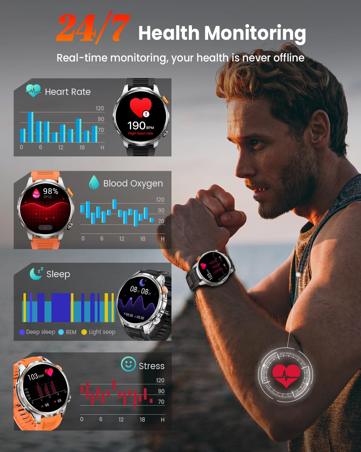 • Цялостно наблюдение на здравето: Този мъжки смарт часовник разполага с високопрецизни сензори за здраве, които позволяват 24/7 анализ на сърдечната честота, насищането на кръвта с кислород (SpO2) и качеството на съня, както и наблюдение на нивото на стрес. Мъжкият часовник ви подкрепя в дихателни упражнения и други методи, насърчаващи здравето. Подробните и изчерпателни данни от наблюдението ви помагат да разберете по-добре физическото си състояние и да развиете здравословни навици за начин на живот.