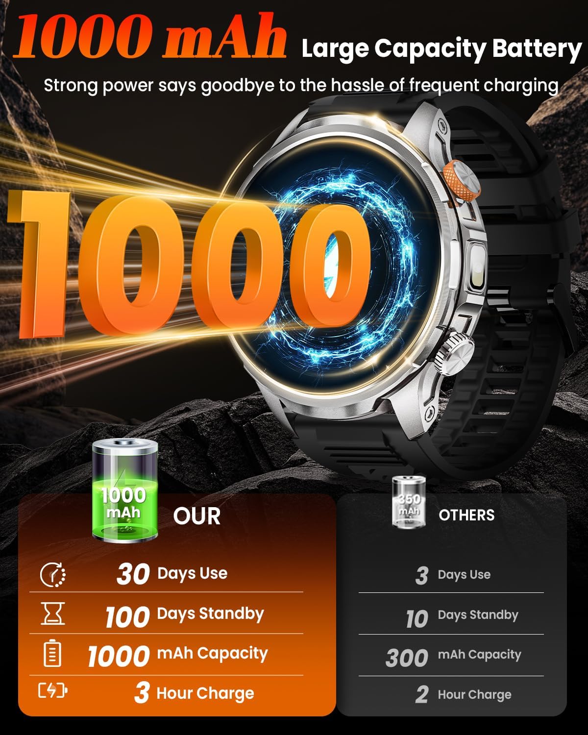 • Военен дизайн и ултра дълъг живот на батерията: този военен смарт часовник за мъже предлага тройна военна защита (удароустойчива, устойчива на надраскване и устойчива на падане) и е водоустойчив до 5 ATM. Това го прави идеален за тежки условия на открито и подводни предизвикателства. Мъжкият смарт часовник има вградена батерия от 1000 mAh с до 30 дни живот на батерията и 100 дни в режим на готовност с 3 часа бързо зареждане. Странична LED светлина осигурява удобно осветление по време на нощни дейности на открито и при спешни случаи.