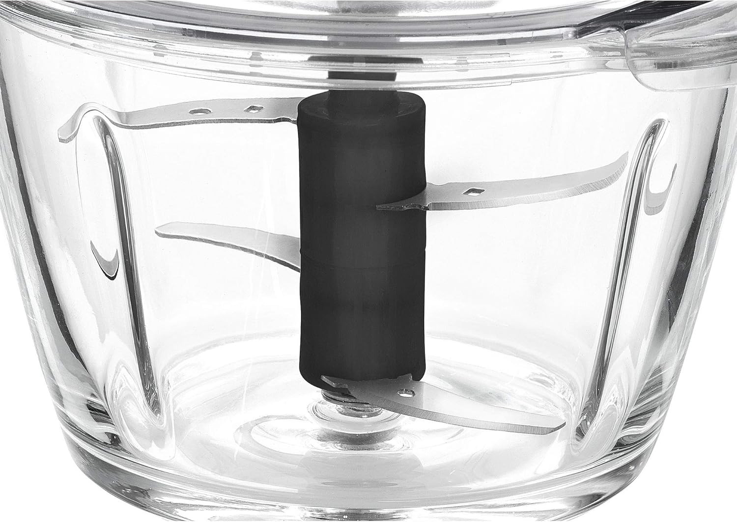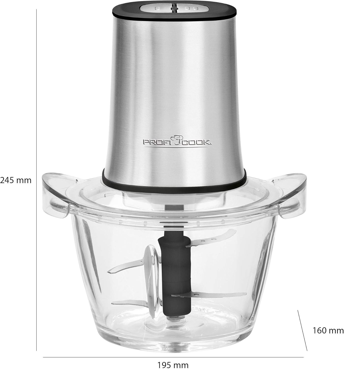 Нарязано за секунди : Когато трябва да приготвите храна бързо или просто предпочитате удобството да нарязвате съставки безопасно и лесно, мулти-чопърът ProfiCook PC -MZ 1150 2-в-1 е идеалният уред за бързо нарязване на голямо разнообразие от съставки. Освен че нарязва зеленчуци, плодове, лук или чесън, PC-MZ 1150 също така обработва лед бързо и лесно. Стъклената купа за смесване е с капацитет приблизително 1 литър . Две настройки на скоростта гарантират перфектна обработка на различни съставки – по-високата скорост смачква твърди съставки като лед, докато по-ниската скорост се справя с по-меки съставки. Можете също да избирате между работа с 2 или 4 остриета . За лесно и бързо почистване , остриетата от неръждаема стомана са сменяеми.