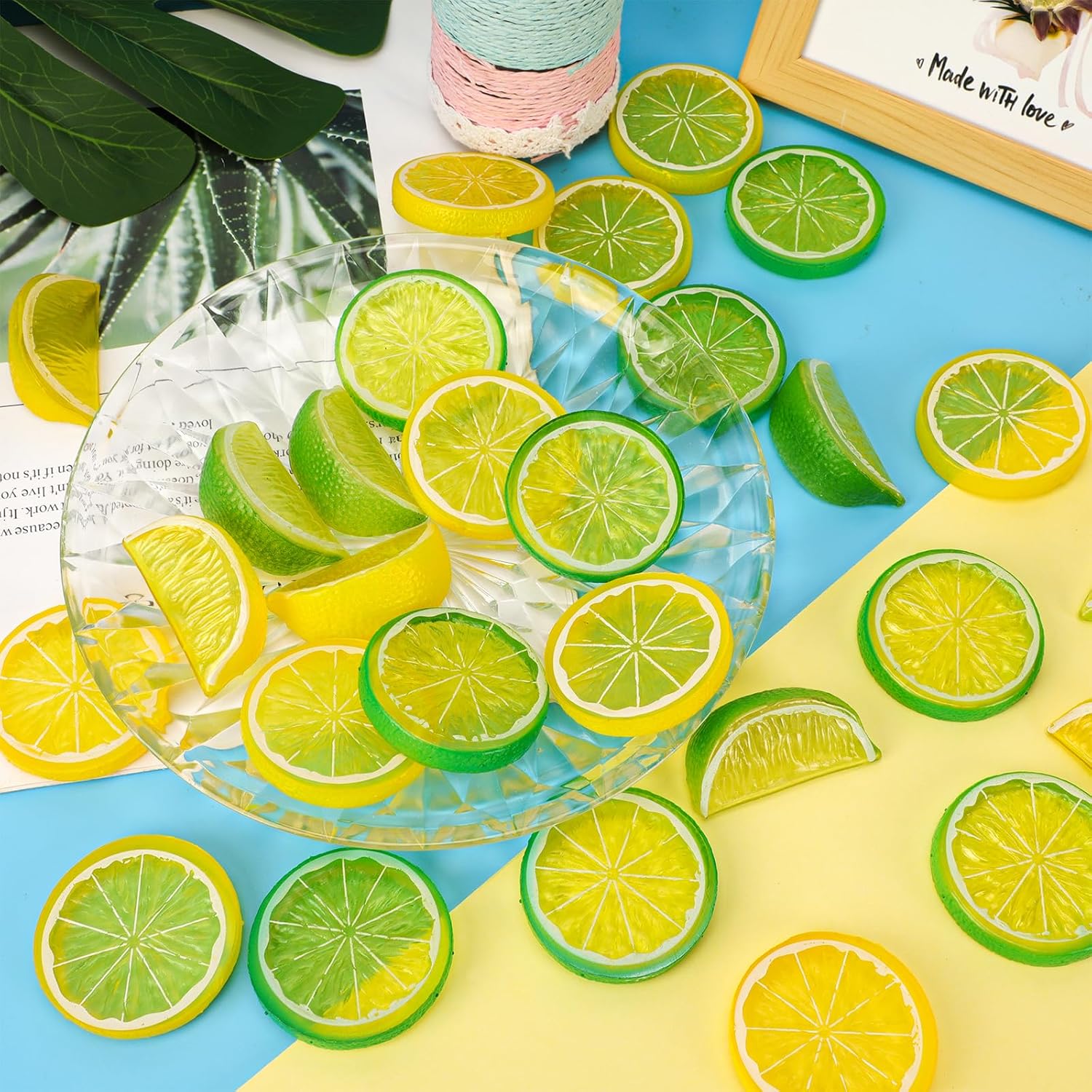 MWOOT Пакет от 30 изкуствени резена лимон, пластмасови имитации на резени плодове за декорация, изкуствени плодове за парти, кухня, пълнител за вази, декорация за маса, занаяти, фотографски реквизит