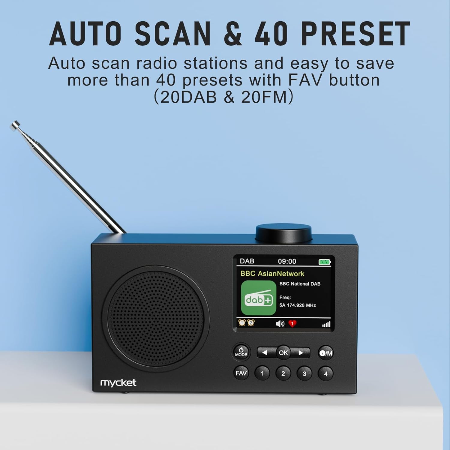 • USB презареждаща се батерия и батерия 2200 mAh: презареждащото се радио има вградена литиева батерия 2200 mAh, която може да се използва до 12 часа с 2,5 часа зареждане чрез включения USB кабел. Mycket Portable DAB+ Radio е вашият перфектен спътник при пътуване, за да се наслаждавате на любимите си радиостанции навсякъде.