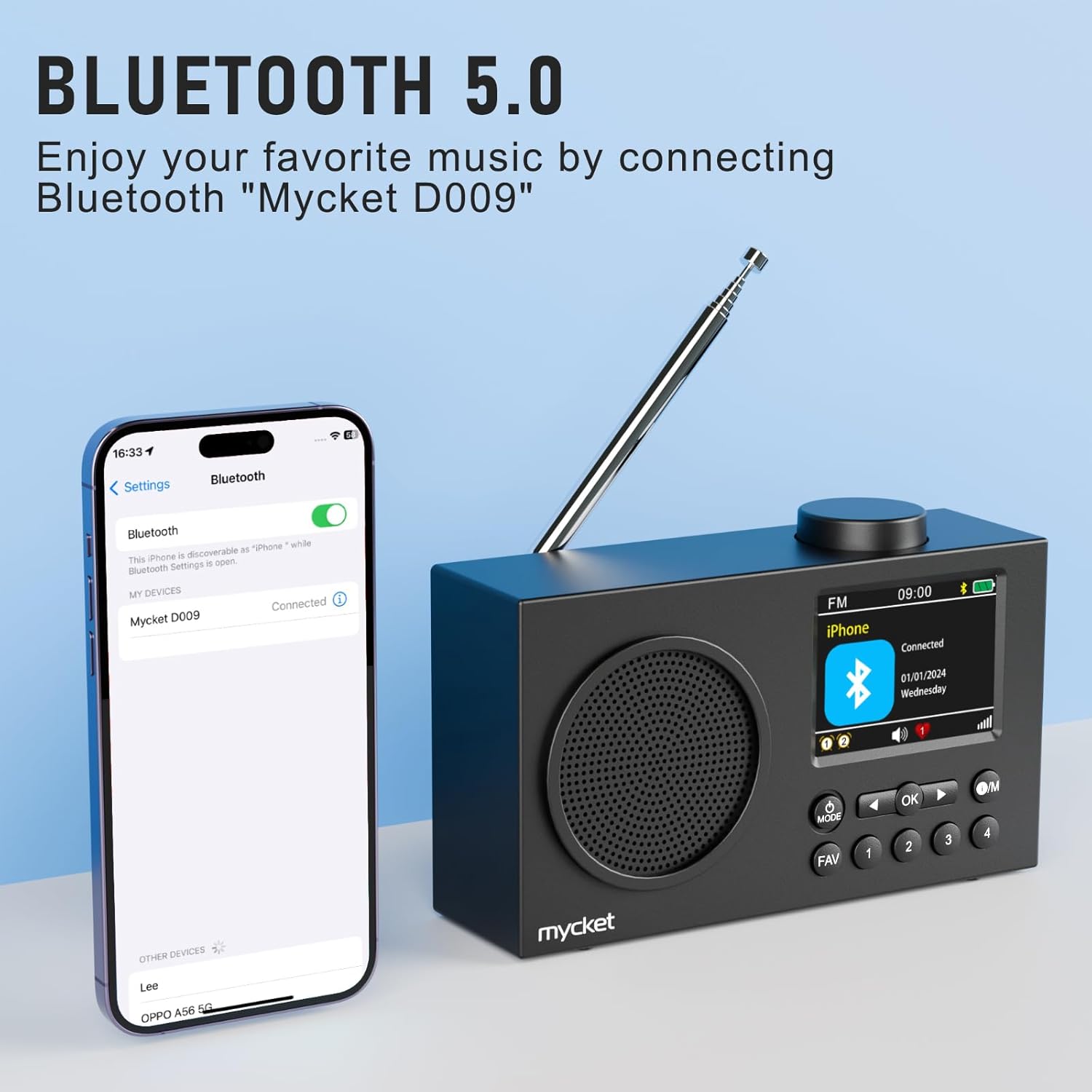 • Преносимо и Bluetooth 5.0: Благодарение на тънкия и компактен дизайн, можете лесно да го съхранявате в раницата или багажа си - в градината, кухнята, хола или в движение - където и да искате да се наслаждавате на музиката си, Mycket Преносимото DAB/DAB+/FM радио с Bluetooth е готово да възпроизвежда любимата ви музика, като се свързва с вашия телефон или таблет чрез Bluetooth. Оборудвано с жак за слушалки, можете да свържете кабелни слушалки, за да се наслаждавате на музика, без да безпокоите другите.