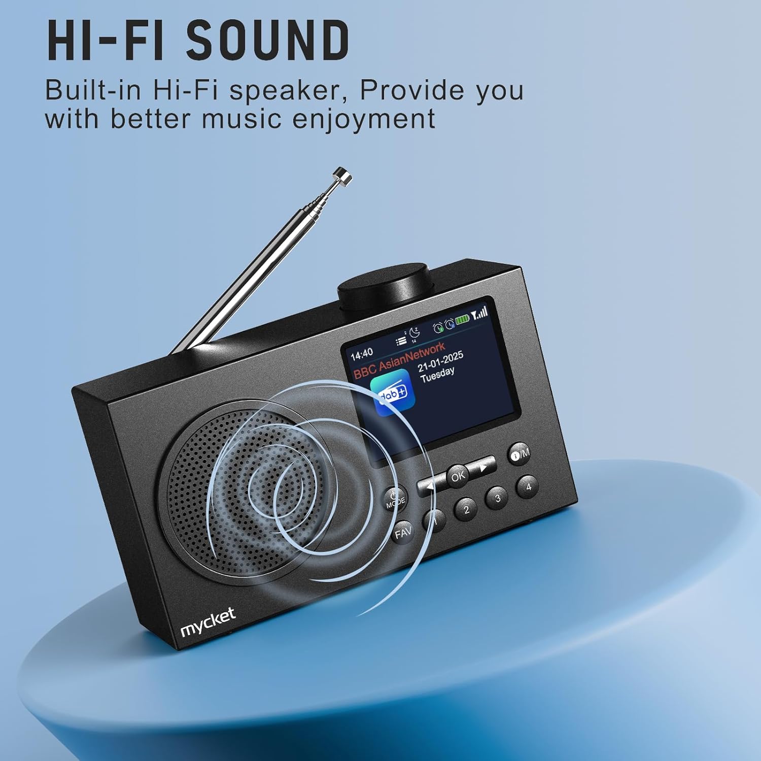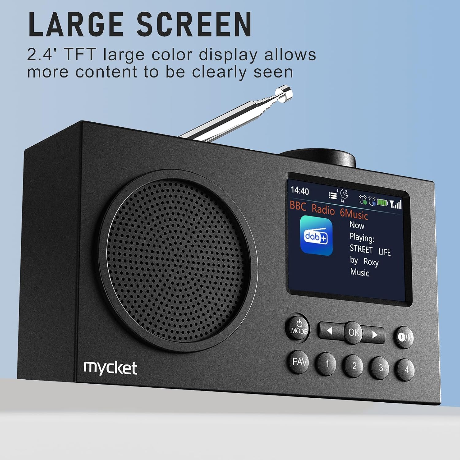 • DAB/DAB+ и FM цифрово радио: Преносимото DAB+ радио Mycket използва най-новата технология за приемане на сигнал, която ви осигурява ясно и отчетливо качество на звука, така че можете да се наслаждавате на любимите си радиостанции навсякъде. DAB предлага подобрено качество на цифровото радио и ви позволява достъп до редица цифрови радиостанции. На ясния цветен LCD екран знаете точно какво чувате.
