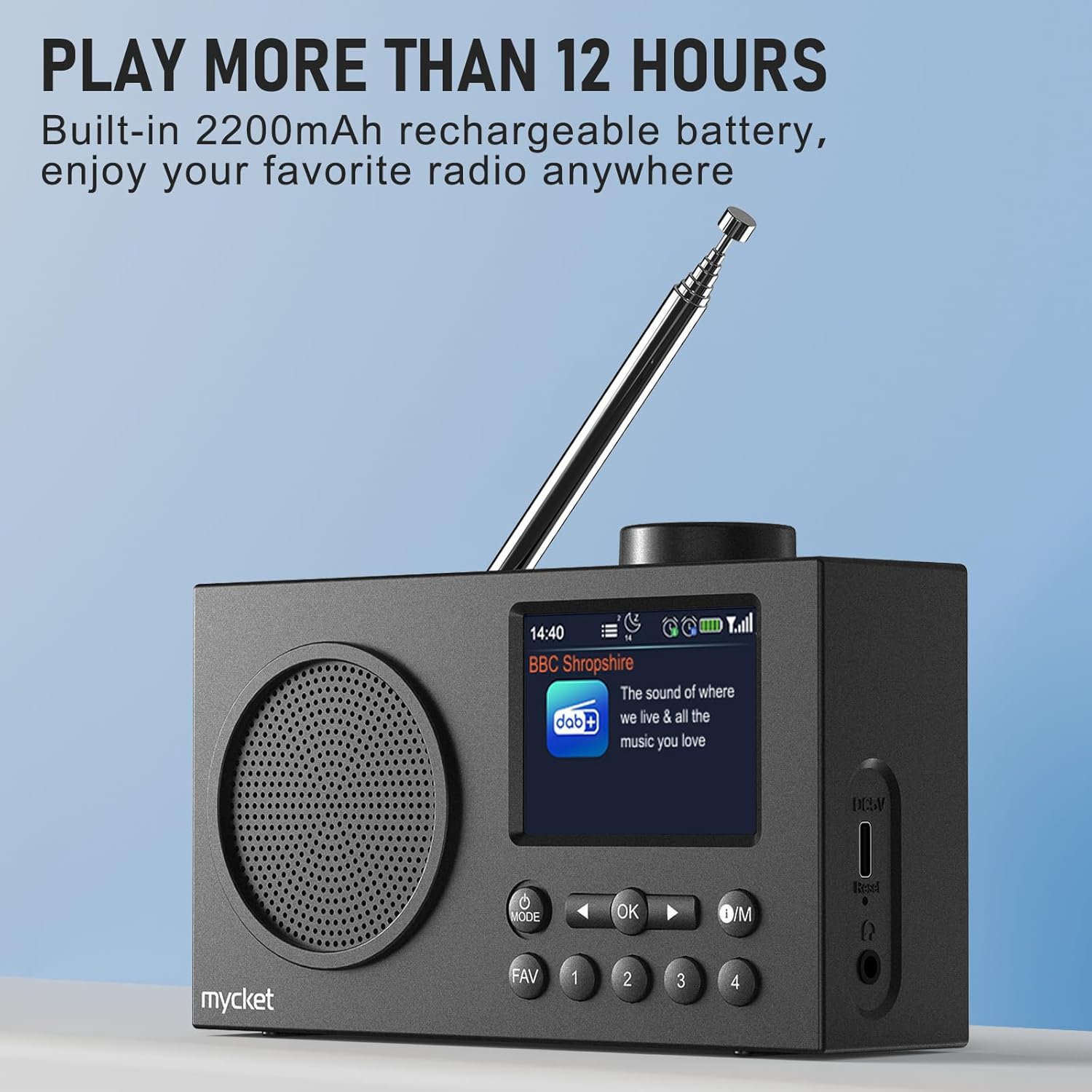 • USB презареждаща се батерия и батерия 2200 mAh: презареждащото се радио има вградена литиева батерия 2200 mAh, която може да се използва до 12 часа с 2,5 часа зареждане чрез включения USB кабел. Mycket Portable DAB+ Radio е вашият перфектен спътник при пътуване, за да се наслаждавате на любимите си радиостанции навсякъде.