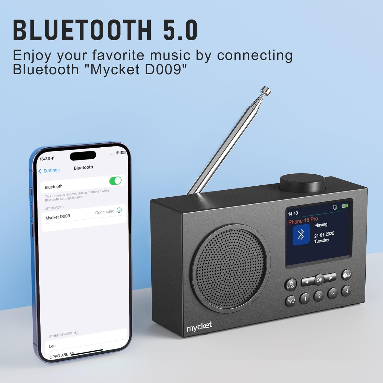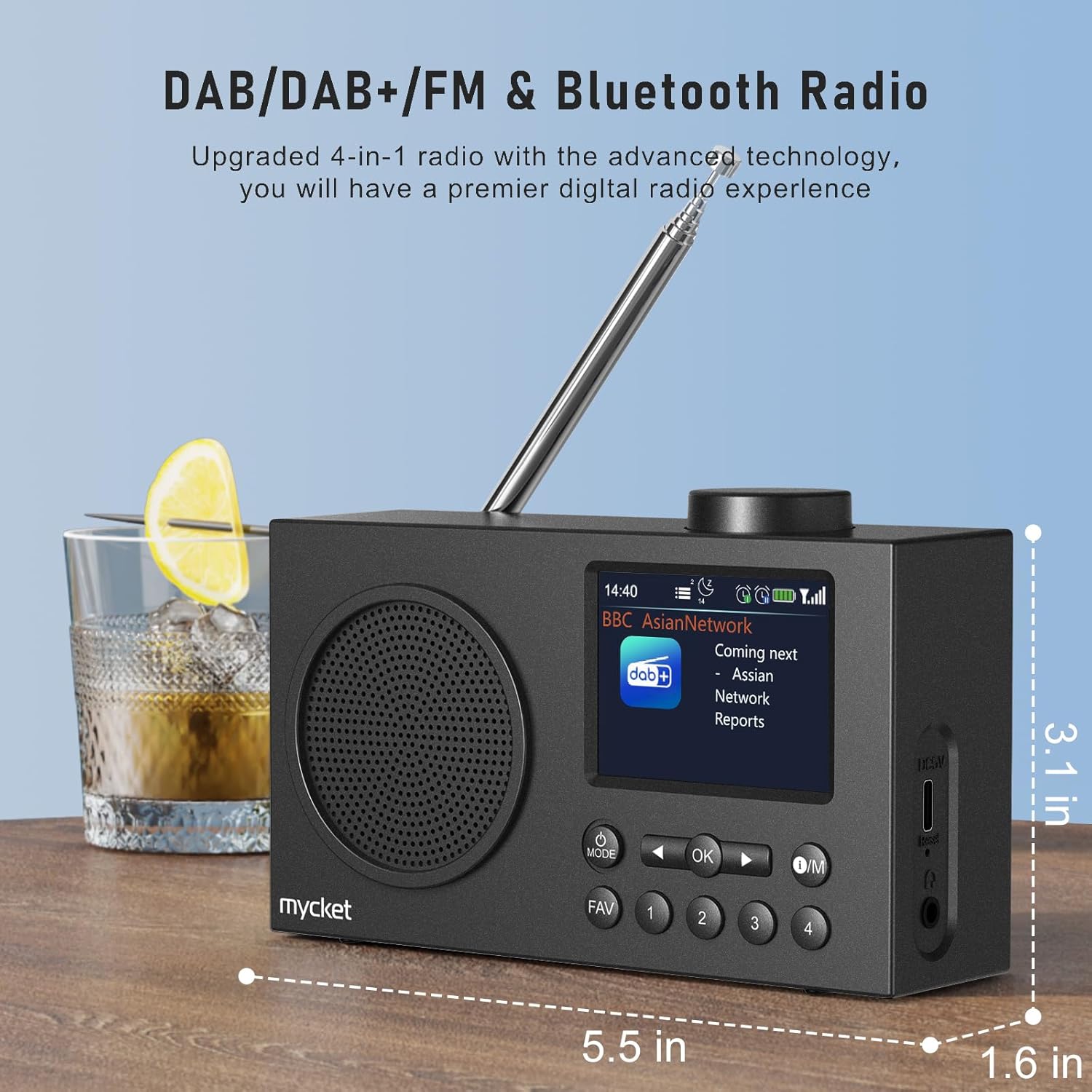• Преносимо и Bluetooth 5.0: Благодарение на тънкия и компактен дизайн, можете лесно да го съхранявате в раницата или багажа си - в градината, кухнята, хола или в движение - където и да искате да се наслаждавате на музиката си, Mycket Преносимото DAB/DAB+/FM радио с Bluetooth е готово да възпроизвежда любимата ви музика, като се свързва с вашия телефон или таблет чрез Bluetooth. Оборудвано с жак за слушалки, можете да свържете кабелни слушалки, за да се наслаждавате на музика, без да безпокоите другите.