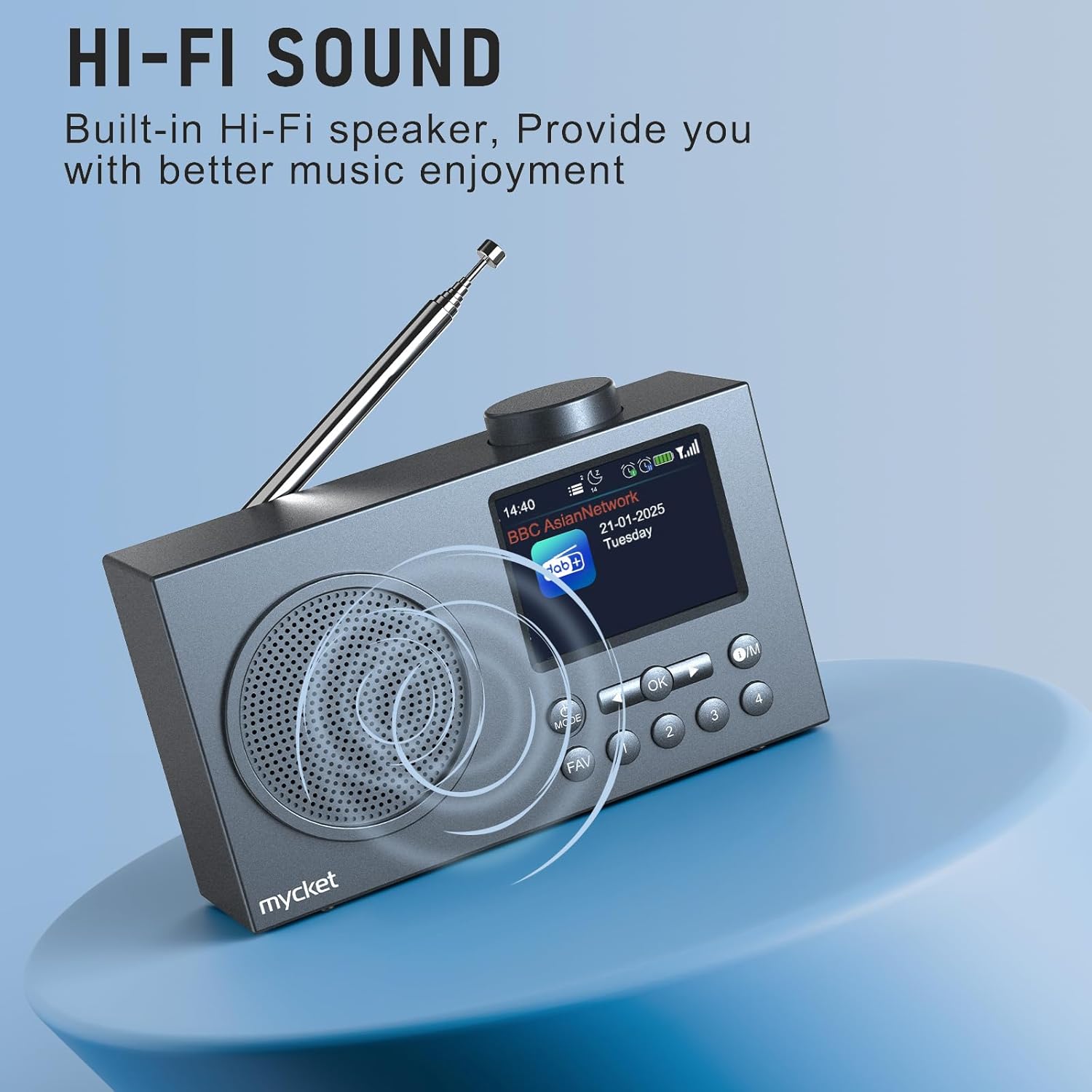 • DAB/DAB+ и FM цифрово радио: Преносимото DAB+ радио Mycket използва най-новата технология за приемане на сигнал, която ви осигурява ясно и отчетливо качество на звука, така че можете да се наслаждавате на любимите си радиостанции навсякъде. DAB предлага подобрено качество на цифровото радио и ви позволява достъп до редица цифрови радиостанции. На ясния цветен LCD екран знаете точно какво чувате.