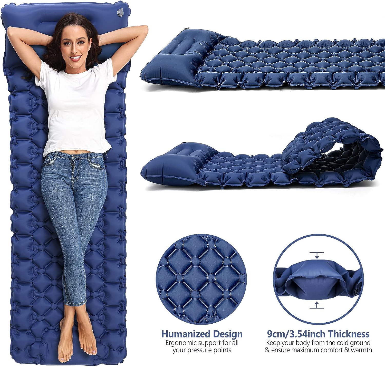 • Постелката за сън Kiaitre е с надута височина 9 см и предпазва тялото ви от студ и груба земя и по този начин осигурява максимален комфорт и топъл сън. Надуваемата постелка за спане със собствена възглавница е ергономично проектирана да поддържа всички точки на натиск и осигурява по-добра опора на тялото и врата.