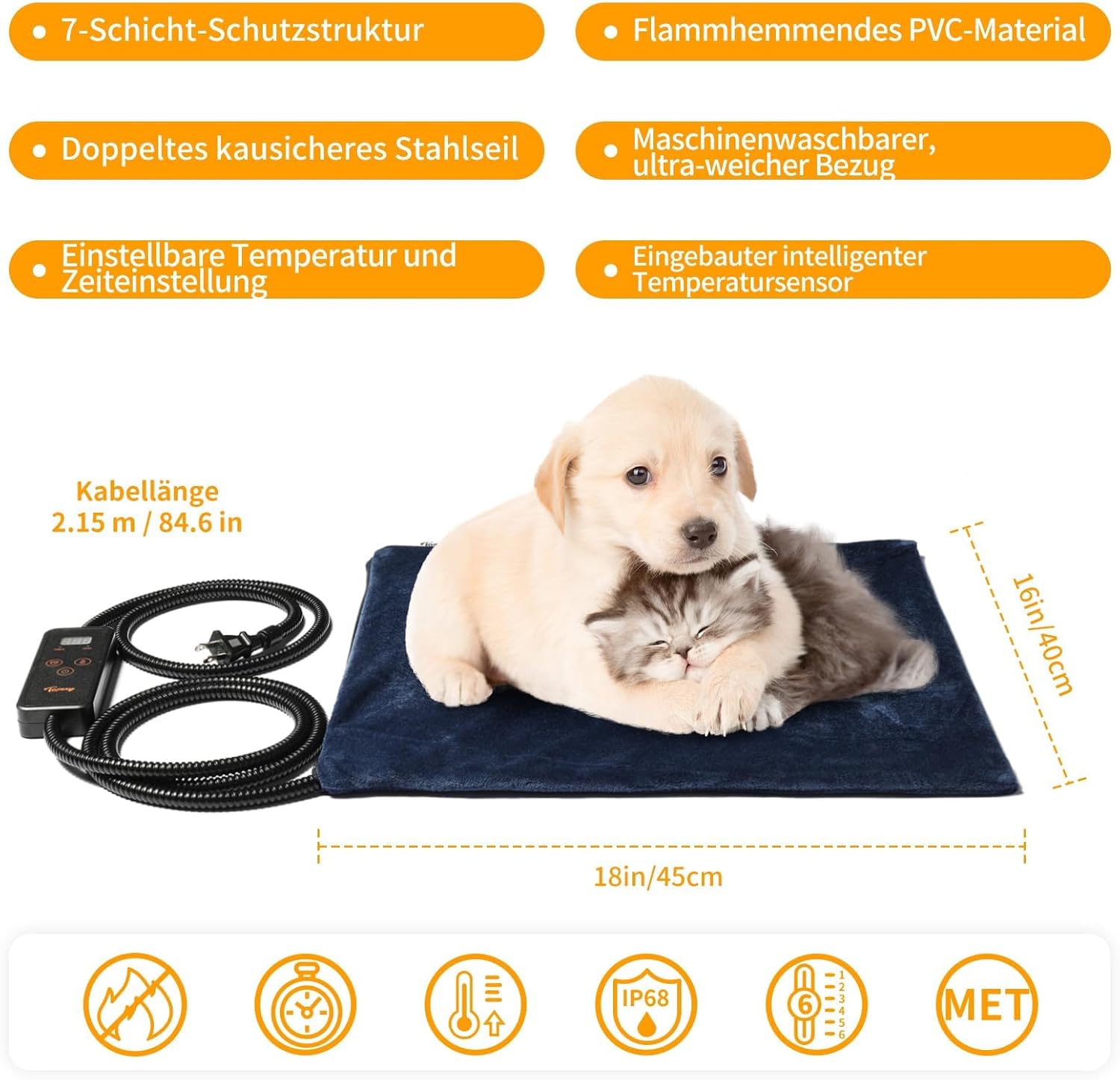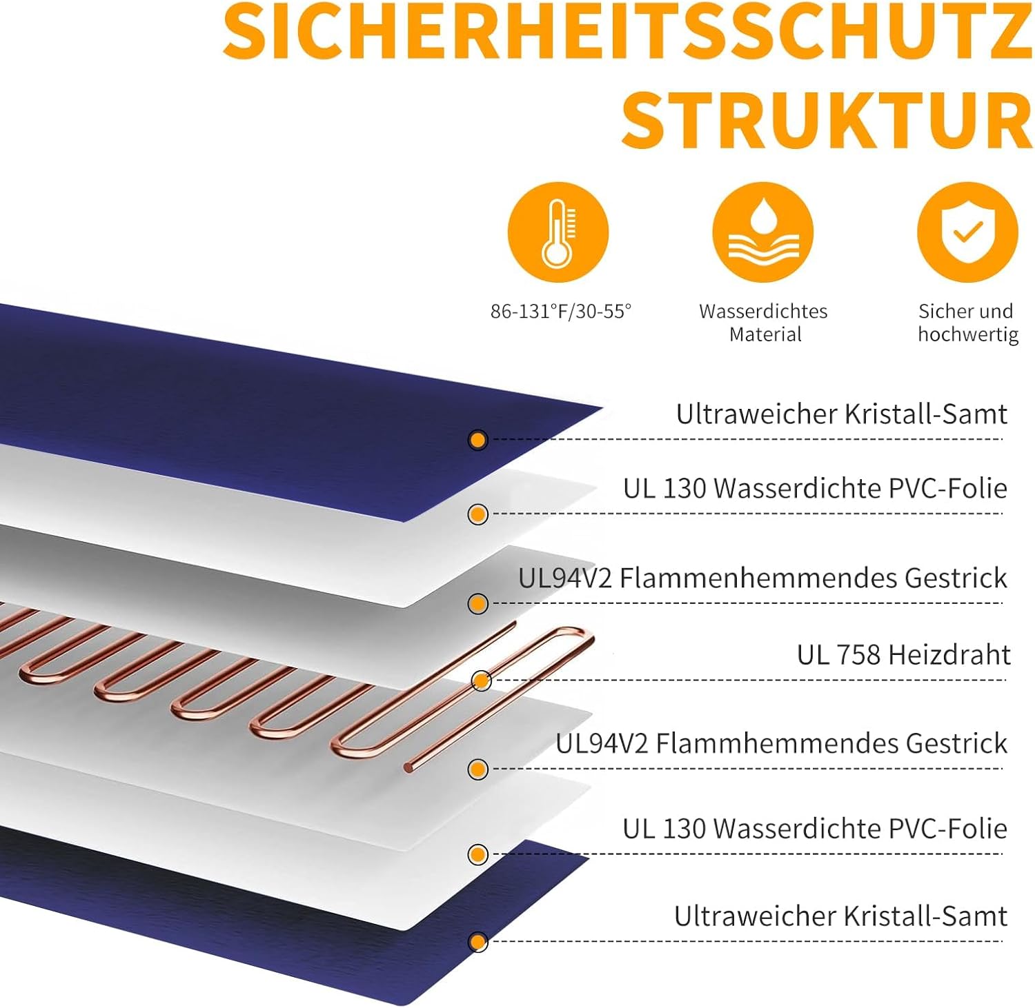 • Безопасна двойна застраховка: 7-слойна защитна структура с UL одобрен нагревателен проводник. Освен това, нагревателният проводник е покрит с проводник за измерване на температурата, така че нагревателната постелка за домашни любимци се изключва автоматично, стига предпазителят да се нагрее до над 55° (131°F) на едно място. Много по-безопасно е от регионален сензор.