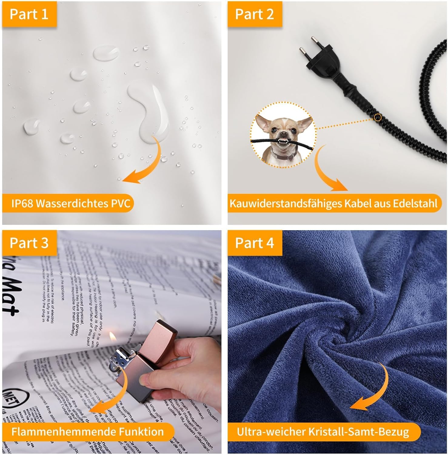 • Подробни акценти: 1. Нагревателната подложка за домашни любимци съдържа два нагревателни проводника и се нагрява по-бързо. 2. Нагревателната подложка за домашни любимци използва усъвършенстван водоустойчив PVC материал IP68. 3. Мекото, удобно кристално кадифено покритие предлага на вашия четириног приятел оптималното място за спане. Сваля се и е лесна за почистване. 4. Устойчиво на дъвчене стоманено въже предотвратява дъвченето на проводниците от кучето. 5. Фиксиран интерфейс за предотвратяване на електрически течове.