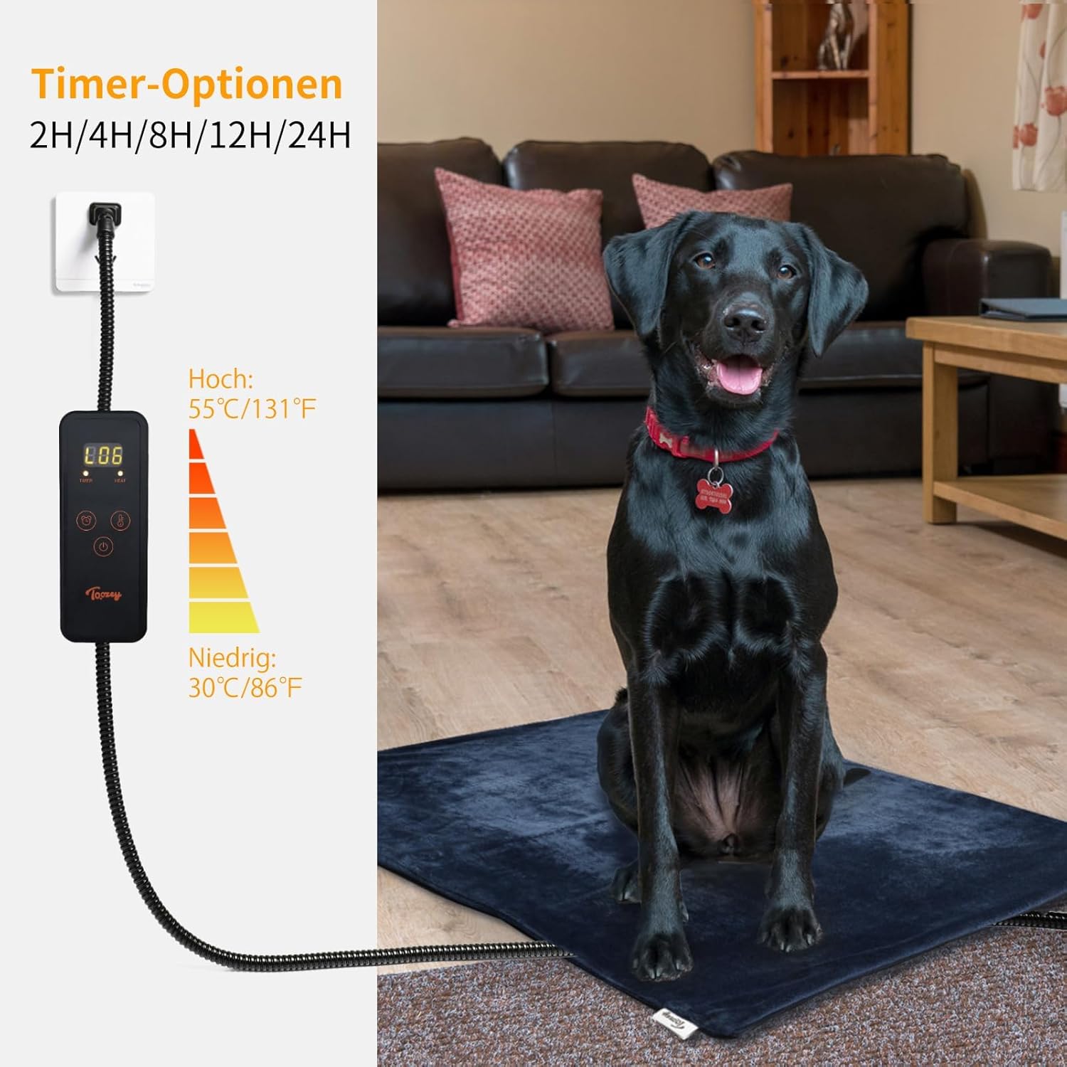 • Таймер и регулируема температура: 5 нива на таймера (2/4/8/12/24H). Нагревателната постелка за кучета ще се изключи автоматично, ако забравите да изключите превключвателя. 6 температурни настройки (от 30°C до 55°C). Няма автоматична постоянна температура на ниво 3 (~ 40°C) - любимата температура на вашия домашен любимец. Единичен кръг осигурява равномерна температура.