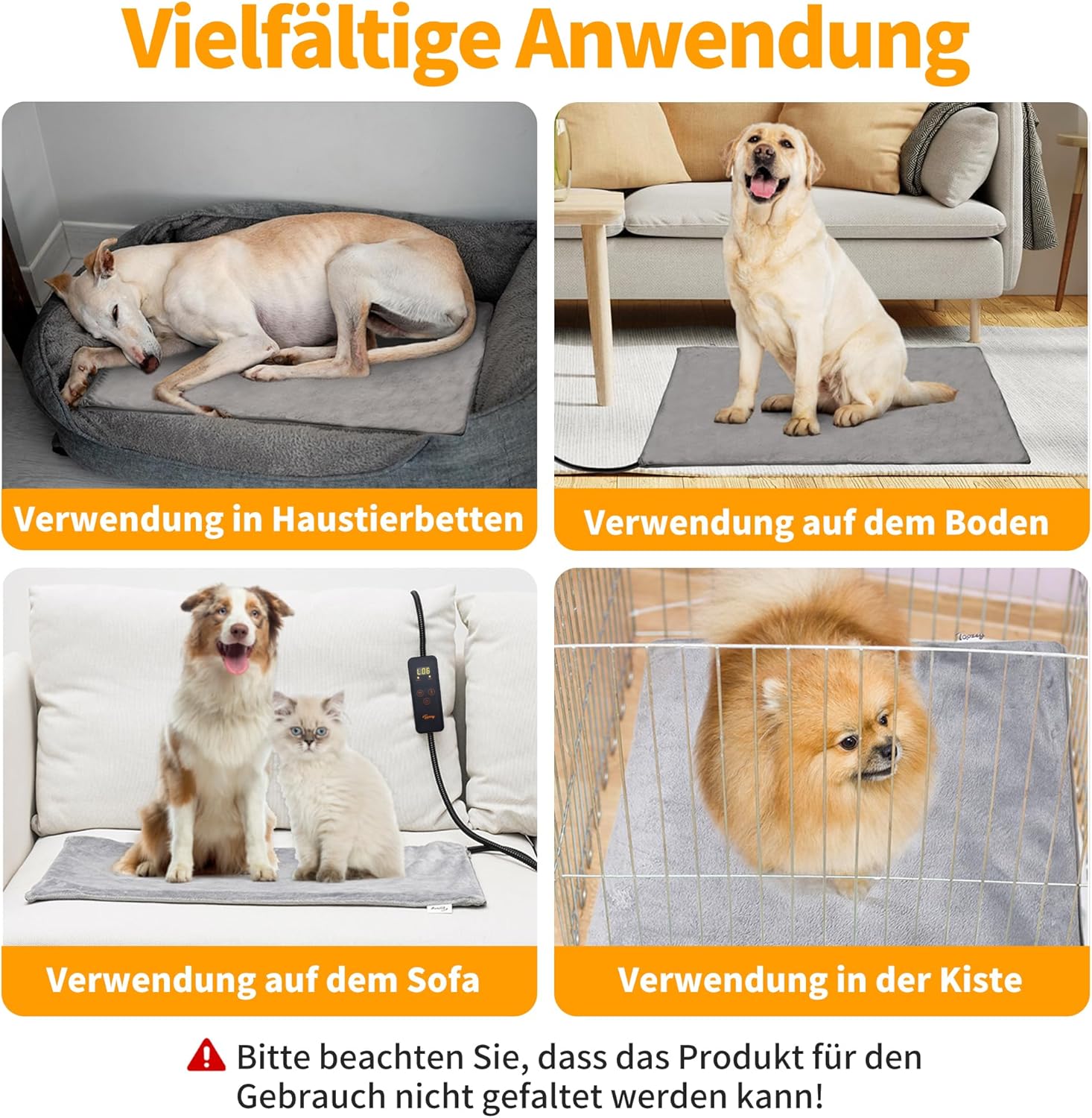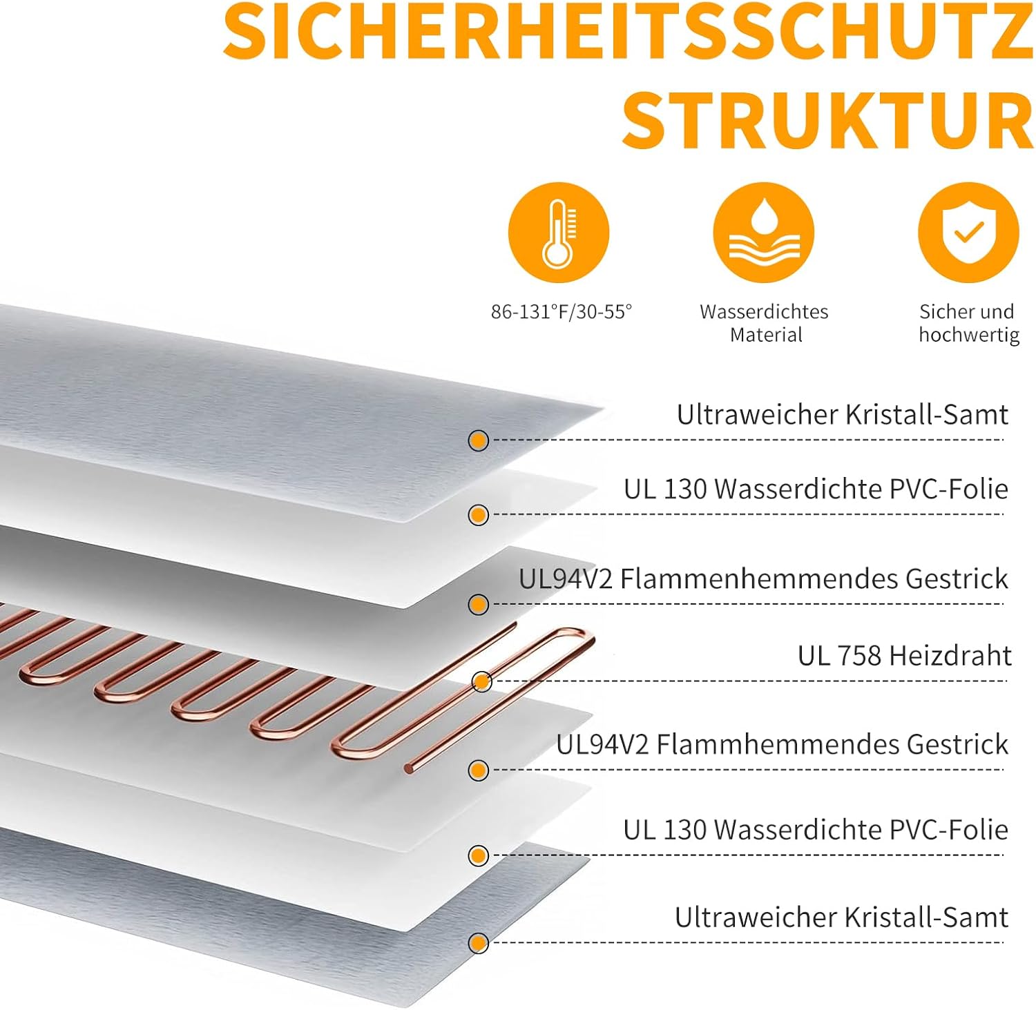 • Безопасна двойна застраховка: 7-слойна защитна структура с UL одобрен нагревателен проводник. Освен това, нагревателният проводник е покрит с проводник за измерване на температурата, така че нагревателната постелка за домашни любимци се изключва автоматично, стига предпазителят да се нагрее до над 55° (131°F) на едно място. Много по-безопасно е от регионален сензор.