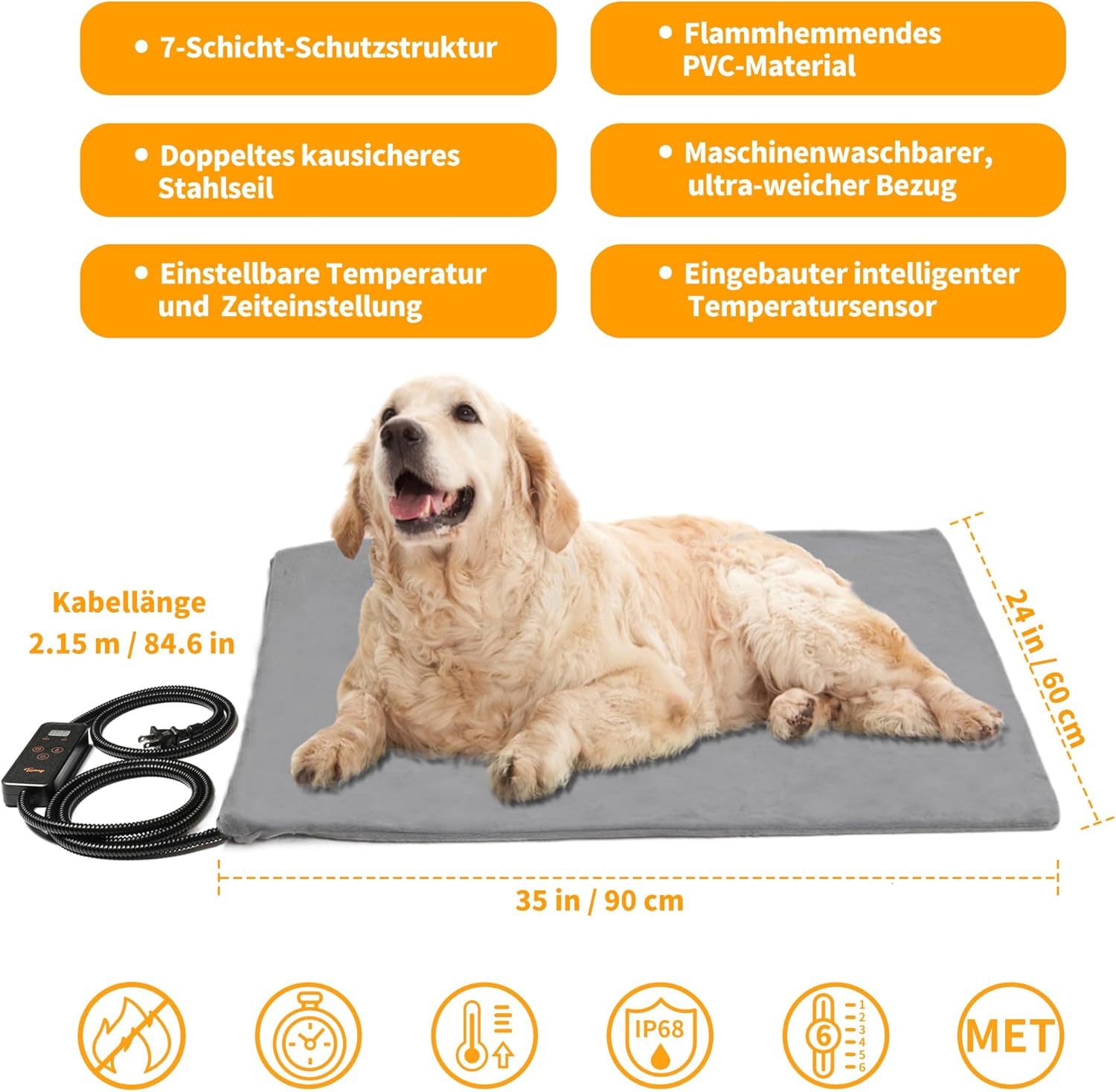 Нагревателна постелка Toozey за котки и кучета, за вътрешна употреба, 90 x 60 см, регулируемо време и температура, безопасно електрическо нагревателно одеяло за домашни любимци, меко нагревателно одеяло за новородени/малки/възрастни котки и кучета, сиво - XL