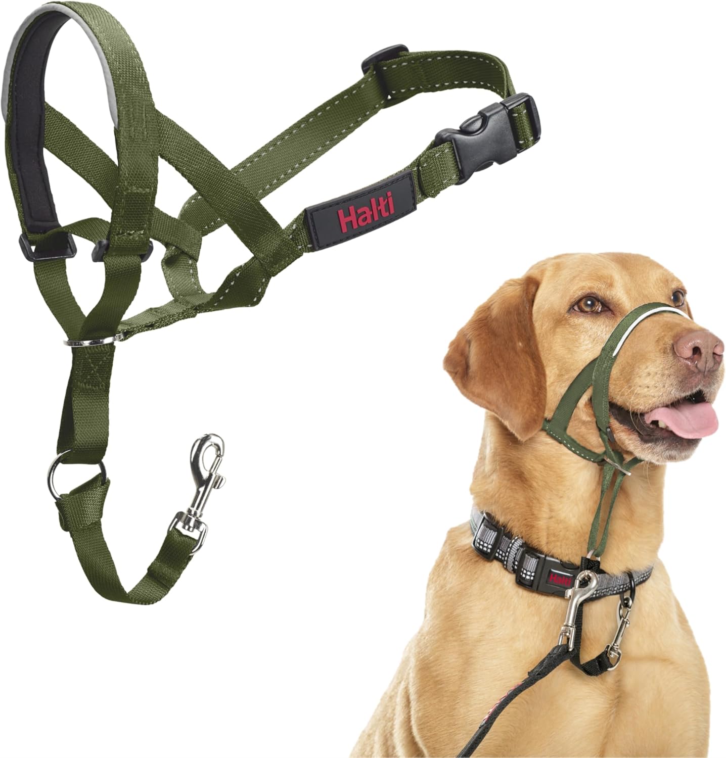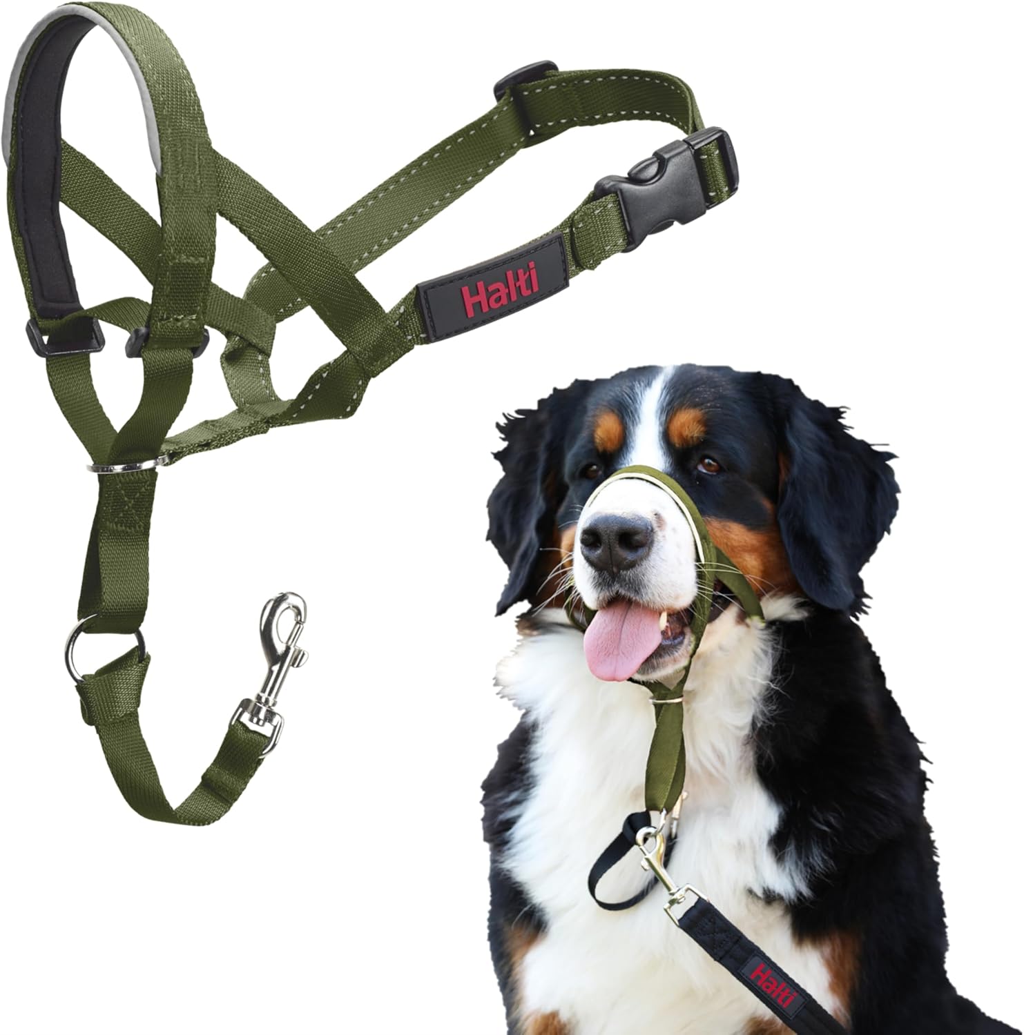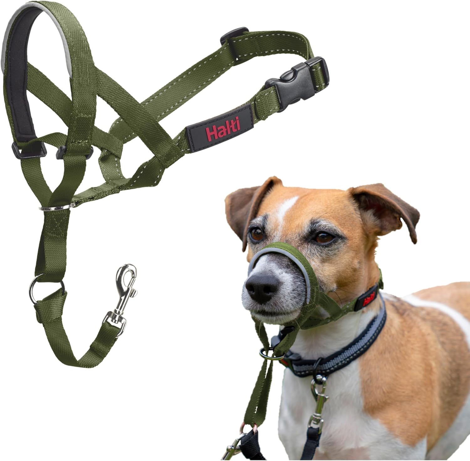 Нагръдник HALTI - Предпазва кучето ви от дърпане на каишката, Лесно регулиране, Лек, с подплатена лента за нос, Нашийник против дърпане за малки кучета (Размер 1, Тъмнозелен)