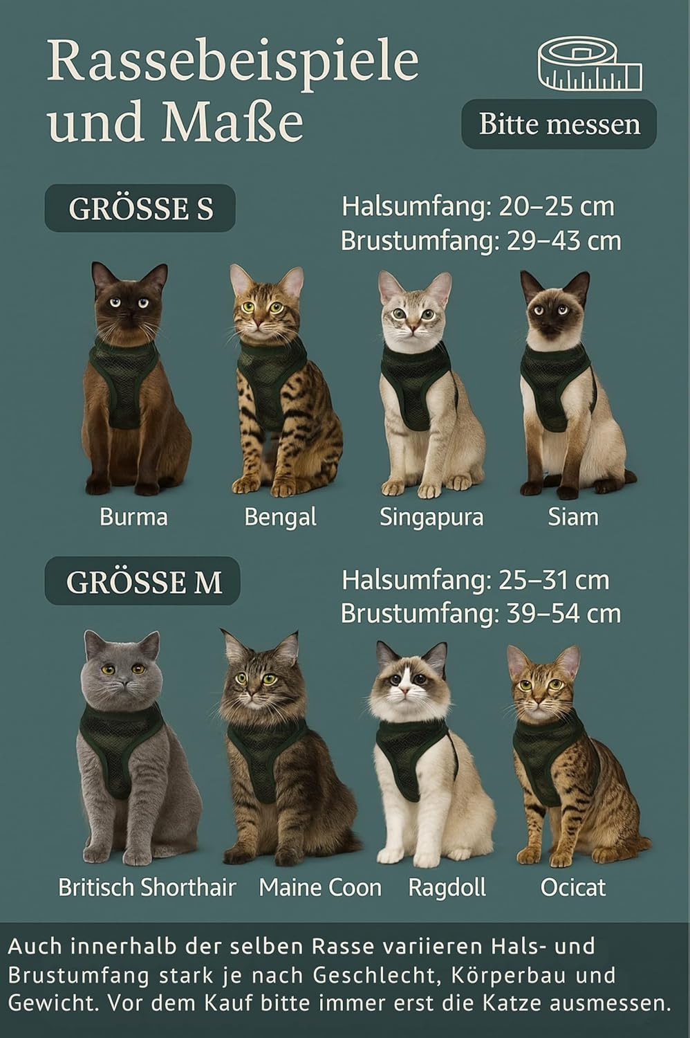A cat harness should not only provide safety, but also fit perfectly and allow your cat maximum comfort. This is exactly where the Beroni cat harness comes in: it combines ergonomic design, breathable materials and an adjustable back length. So the harness sits optimally, prevents fur breakage and clings to the body of your cat as a gentle chest harness. The escape proof design gives you peace of mind on every walk. Sturdy click fasteners, robust D-rings and the sophisticated fit make the Beroni cat harness a reliable companion - whether in the garden, on the balcony or when walking on the lead. Many cat owners know the problem: standard harnesses slip, tight or lead to bald spots in the coat. The Beroni cat harness is specially designed to avoid just that. Thanks to the adjustable back length, the harness can be individually adjusted - whether Maine Coon, Bengal, Ragdoll, British Shorthair, Siam or domestic cat. Every cat gets the perfect fit that ensures comfort and safety. Made of high-quality airmesh material, the cat harness is particularly light, soft and breathable. It prevents heat build-up and is ideal for active cats who like to explore new things. Even sensitive breeds such as the Ragdoll accept the soft harness faster as it is placed on the side - no over-the-head pulling necessary. With Beroni you choose proven quality that customers have appreciated for years. Our products combine experience, modern design and the highest standards of safety and comfort. The complete product development and design come from Germany, which makes every detail perfectly adapted to the needs of cats. Whether playful young cat or cosy house cat - the Beroni cat harness is the ideal choice for shared adventures. It combines maximum safety with comfortable wearing comfort and ensures that you and your cat can discover the world relaxed and confidently. Beroni premium cat harness in proven quality. Developed in Germany for happy cats and satisfied owners.